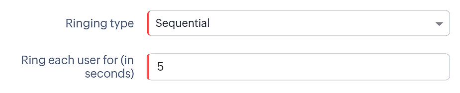 Secvențial: Apelul va fi direcționat către utilizatori în ordine. Poți seta limita de timp pentru ca un utilizator să preia apelul. Dacă limita de timp este depășită, apelul trece la următorul utilizator.Ordinea de direcționare va fi ordinea în care utilizatorii s-au autentificat în Zoho CRM. Dacă un utilizator nu este disponibil, apelul va fi direcționat către următorul utilizator. Poți direcționa apelul către alte stări în cazul în care apelul a expirat, dacă niciun utilizator nu este disponibil sau dacă toți utilizatorii sunt ocupați în alte apeluri.