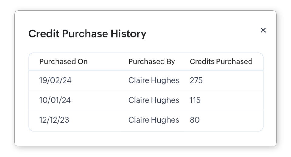 - În fereastra pop-up Istoric Achiziții Credite, vei vedea lista tuturor achizițiilor de credite cu detalii precum: