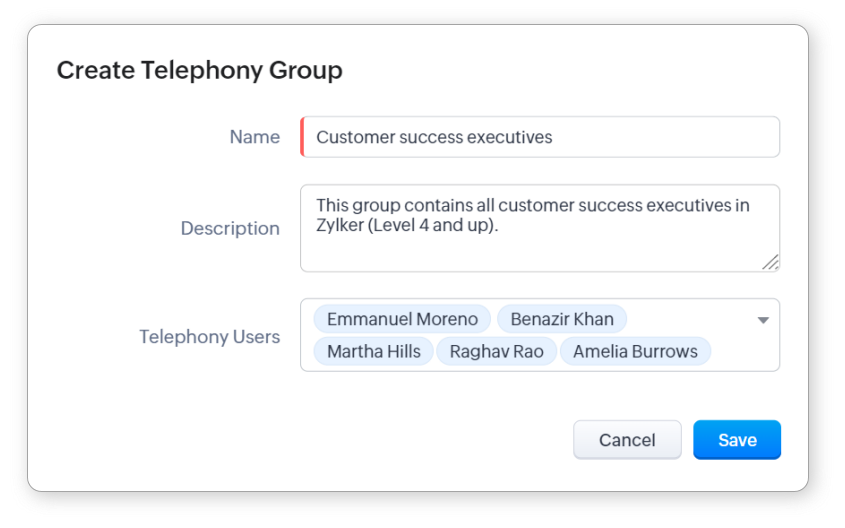 - În fereastra pop-up Creează Grup de Telefonie, introdu Numele și Descrierea grupului.