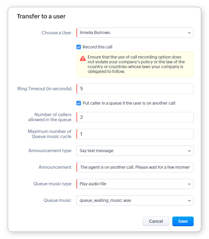 - Transfer către un utilizator: Folosește aceasta când dorești să direcționezi apelul către un anumit utilizator de telefonie.