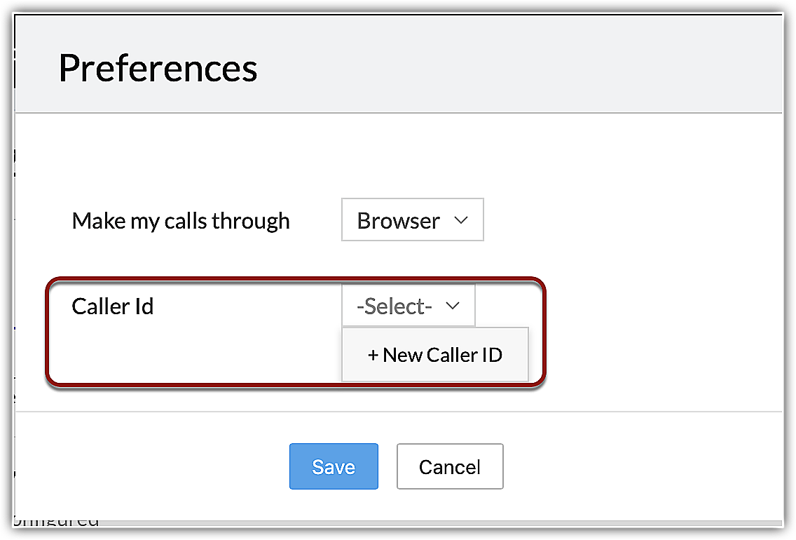 - Selectează opțiunea +New Caller ID din pagina Preferences .