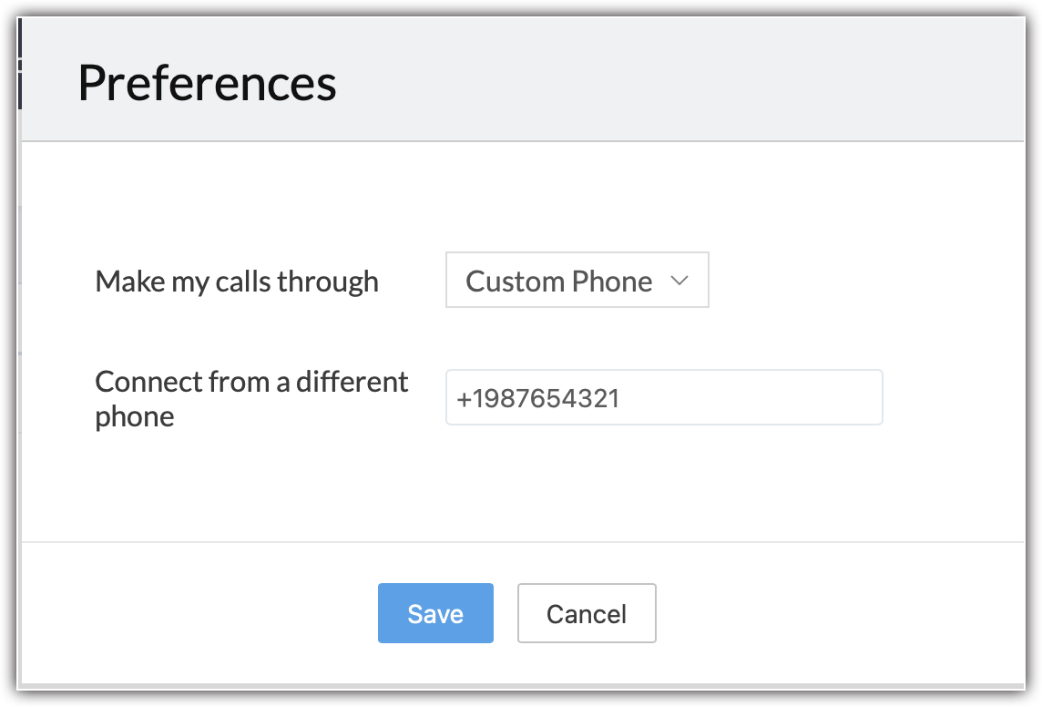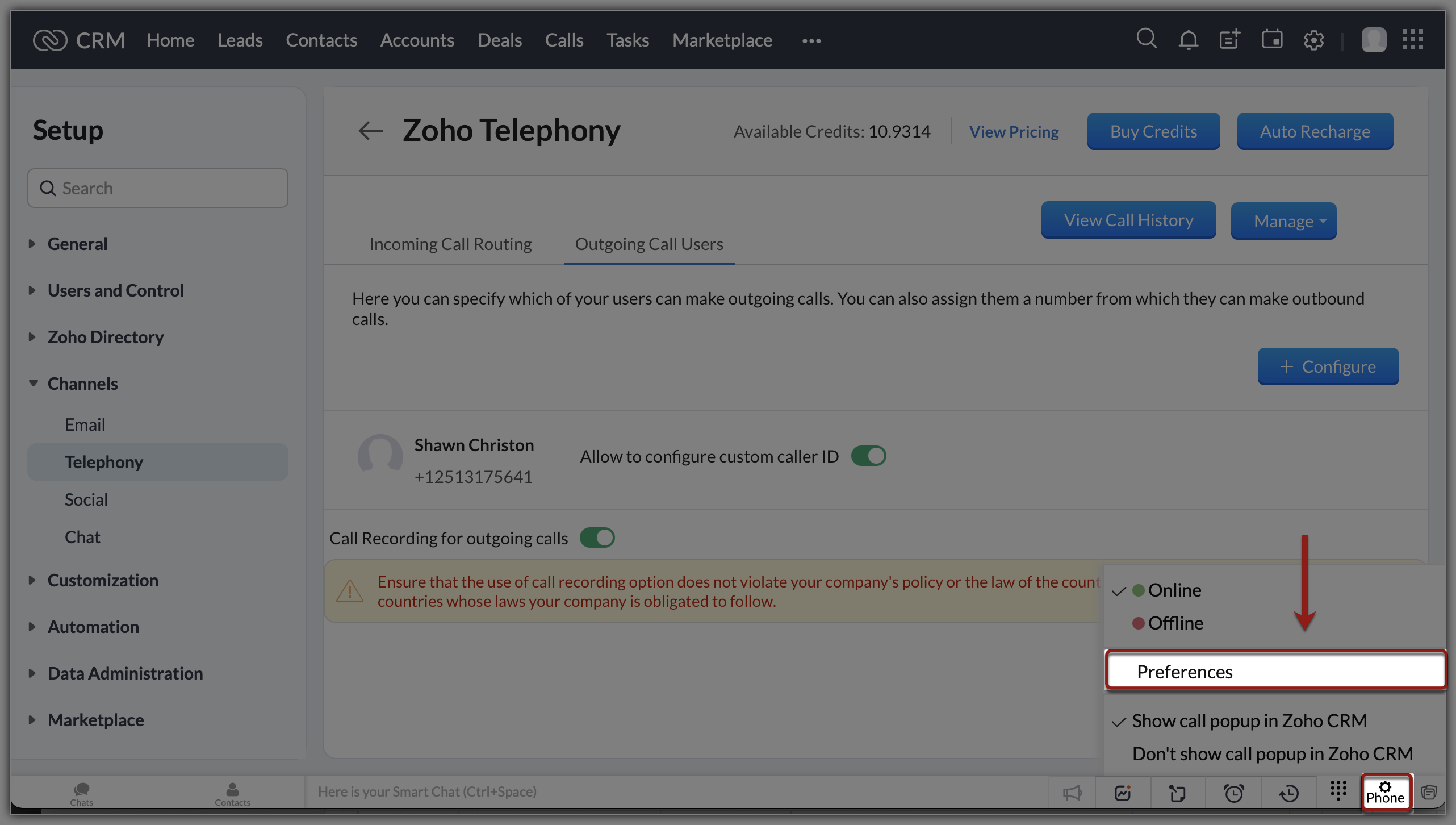 - Fă clic pe opțiunea Phone din partea de jos a CRM și selectează Preferences .