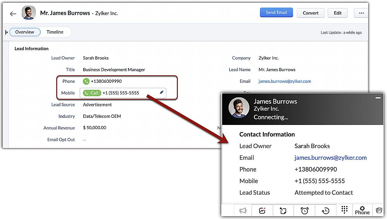 - Fă clic pe iconița Call de lângă numărul de telefon sau mobil de pe pagina de detalii a înregistrării.