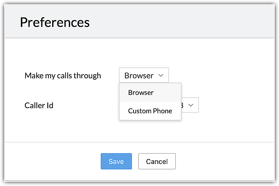 Fiecare utilizator își poate seta propriile preferințe individuale pentru gestionarea apelurilor de ieșire. Poate personaliza modul în care apelurile vor fi conectate (Browser sau Custom Phone ) și defini setările pentru Caller ID .
