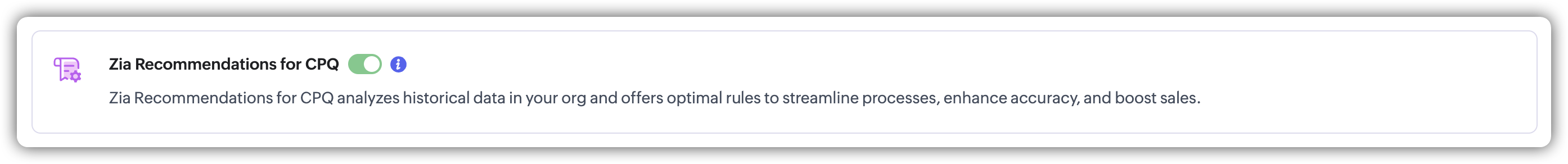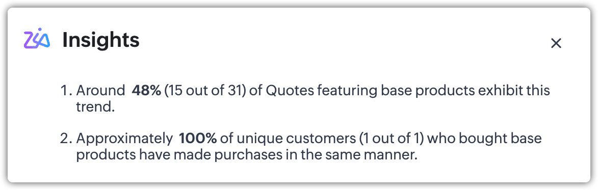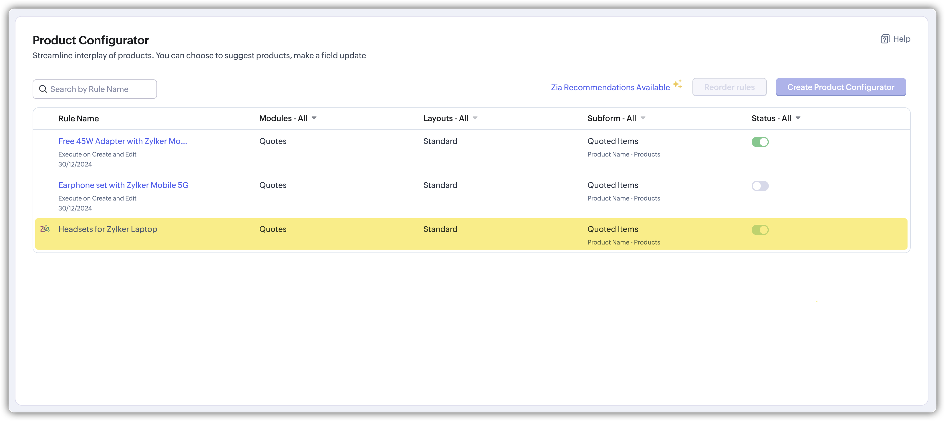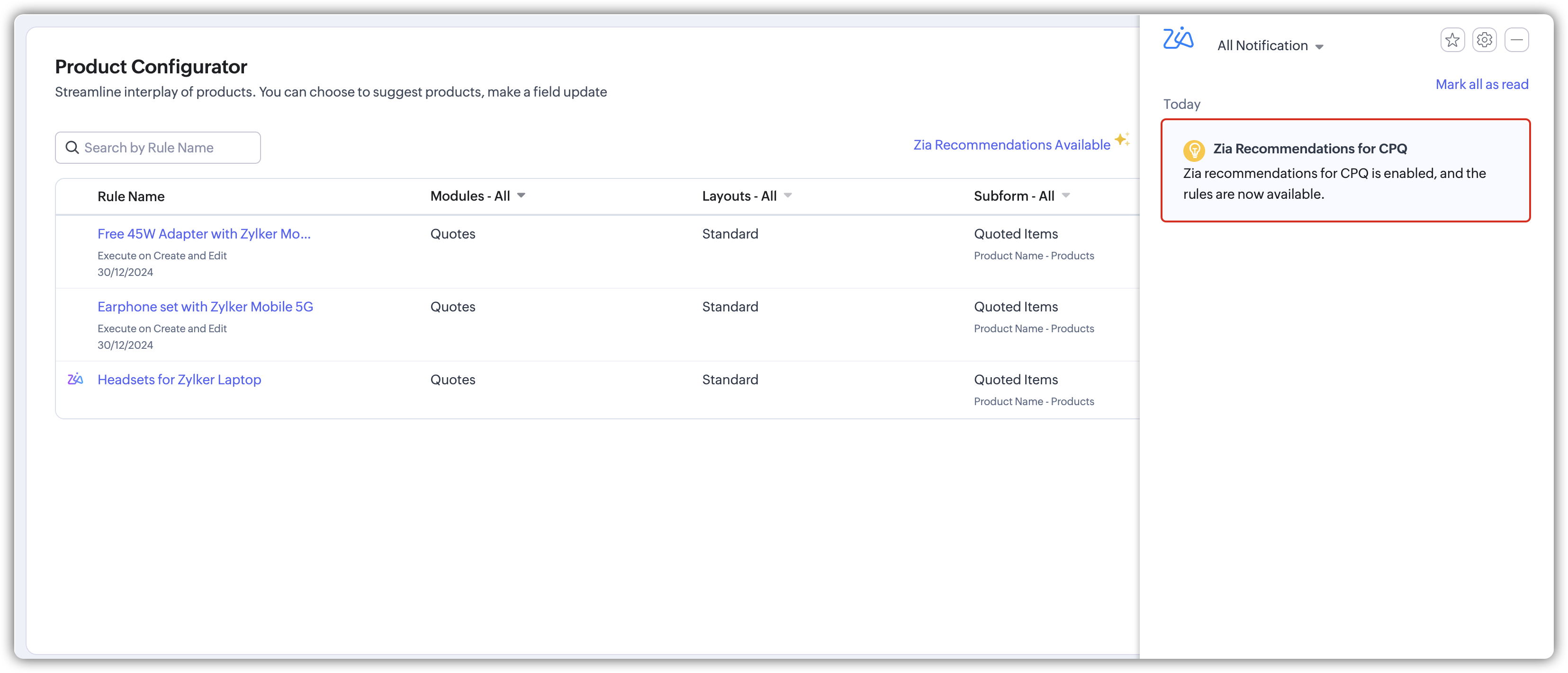 Funcția Zia Recommendation pentru CPQ din Zoho CRM permite sugestii inteligente de reguli pentru Product Configurator (PC) în modulul CPQ. Această funcție este concepută pentru a studia tiparele de cotare din cadrul unei organizații și pentru a le recomanda automat ca regulă PC. Utilizatorii pot valida și activa aceste reguli pentru a automatiza combinațiile de produse în timpul cotării, eliminând necesitatea ca reprezentanții de vânzări să le adauge manual de fiecare dată.