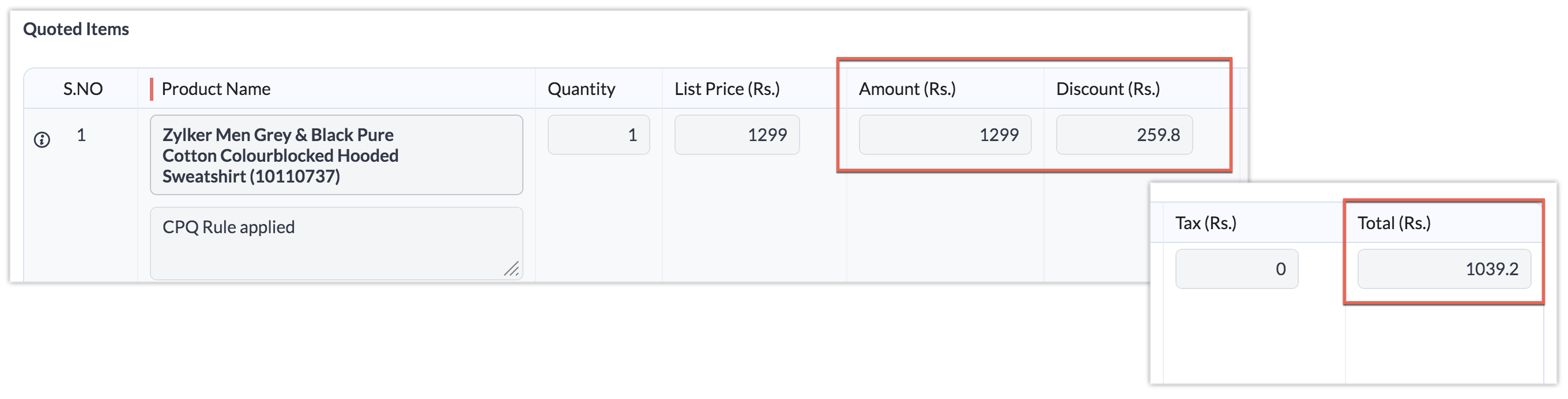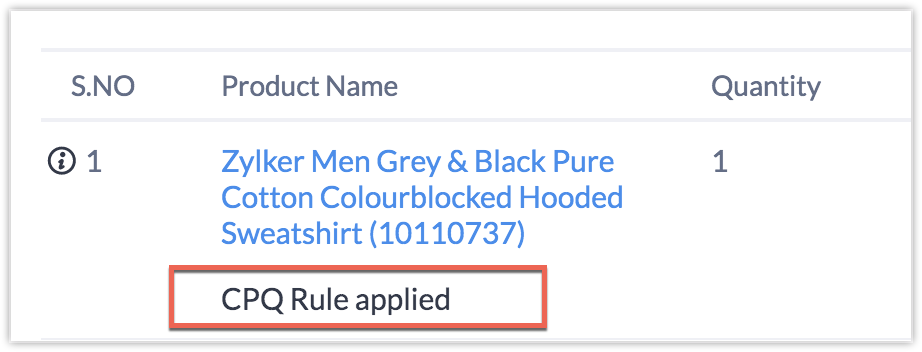 Conform acestei reguli, de fiecare dată când produsul "Zylker Men Grey & Black Pure Cotton Colourblocked Hooded Sweatshirt" este adăugat la o ofertă de preț și în momentul în care oferta este salvată în CRM, această regulă va fi declanșată. Ca rezultat, motorul CPQ va "adăuga" automat fularul la ofertă conform configurației produsului.