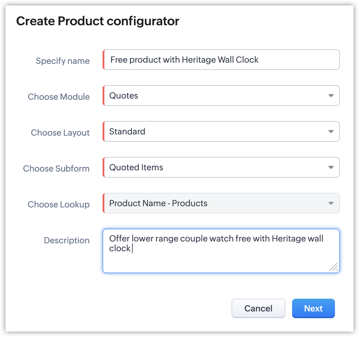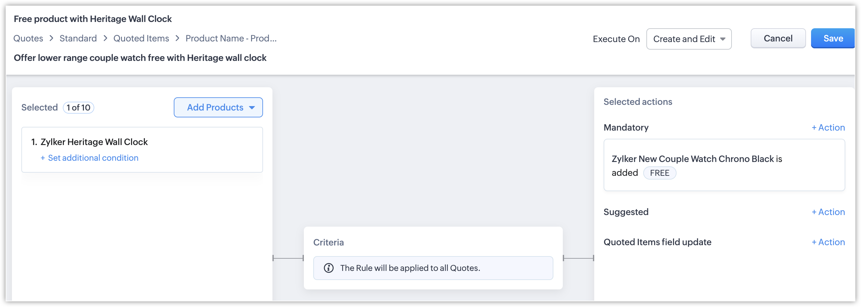 De exemplu, să luăm cazul Zylker Watches. Ceasurile lor de cuplu variază de la ₹2500 la ₹50000. Când sunt cumpărate separat, se aplică prețul de listă al ceasului de cuplu selectat. Totuși, pentru a încuraja achiziția, Zylker decide să facă un tip specific de ceas de cuplu în valoare de ₹2500 gratuit la achiziția unui Zylker Heritage Wall Clock în valoare de ₹10890. Când este cumpărat separat, ceasul de cuplu vine cu prețul său, totuși, la achiziția ceasului de perete, poate fi oferit ca produs gratuit. Acest lucru poate fi configurat ușor în CPQ prin simpla marcare a produsului ca "Produs gratuit" ca parte a configurației produsului pentru Heritage Wall Clock.