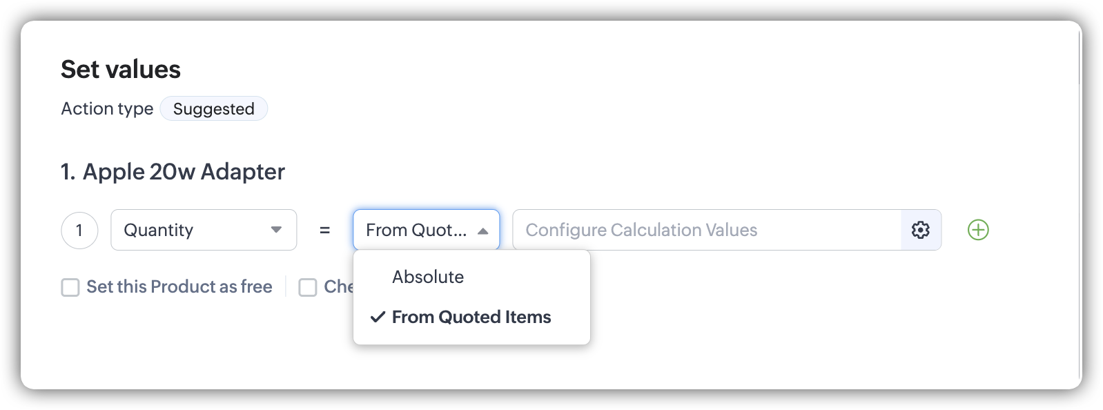 - Dacă dorești ca cantitatea elementului adăugat/sugerat să se schimbe dinamic pe baza cantității elementelor cotate, selectează From Quoted Items și apasă link-ul Configure.