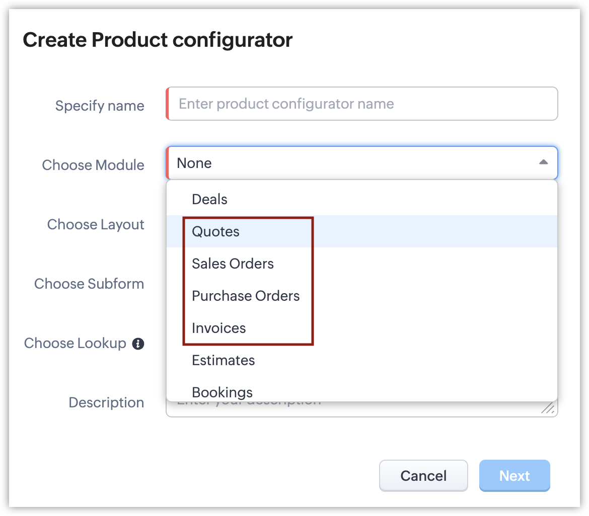 - Atât Product Configurator cât și Price Rules pot fi configurate pentru module implicite și personalizate în Zoho CRM.