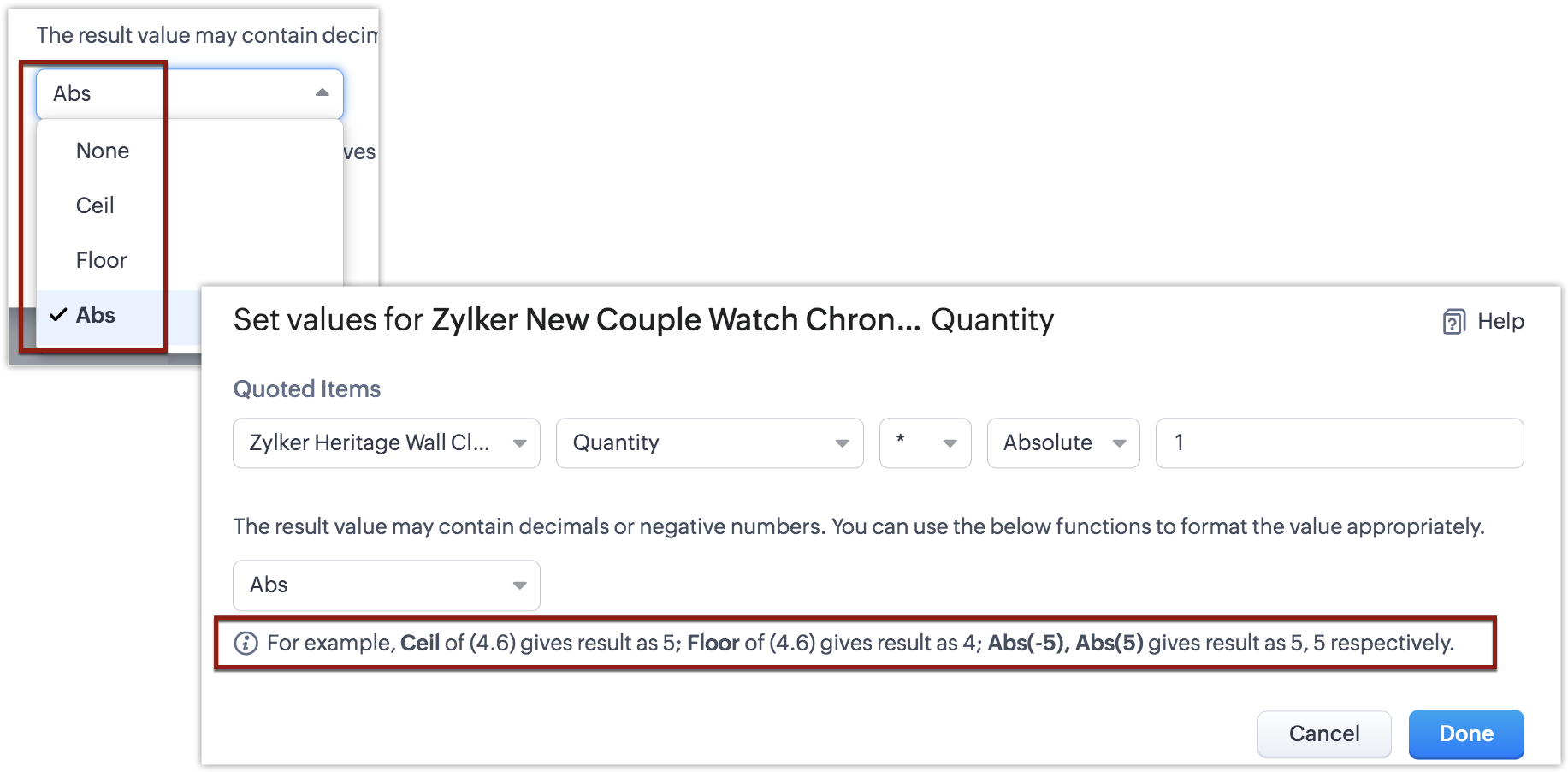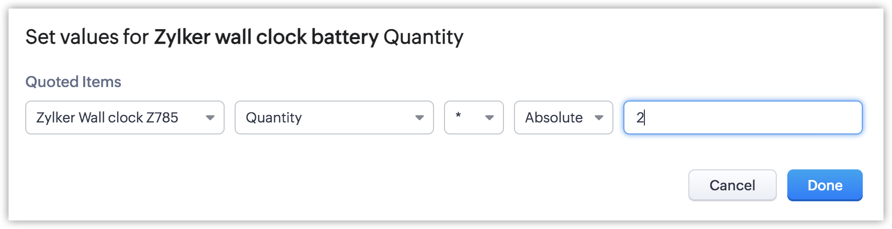 Acest ecran de configurare nu este altceva decât o reprezentare a unei formule pentru actualizarea dinamică a câmpului de cantitate. - Selectează parametrii necesari conform nevoilor tale și apasă Done.