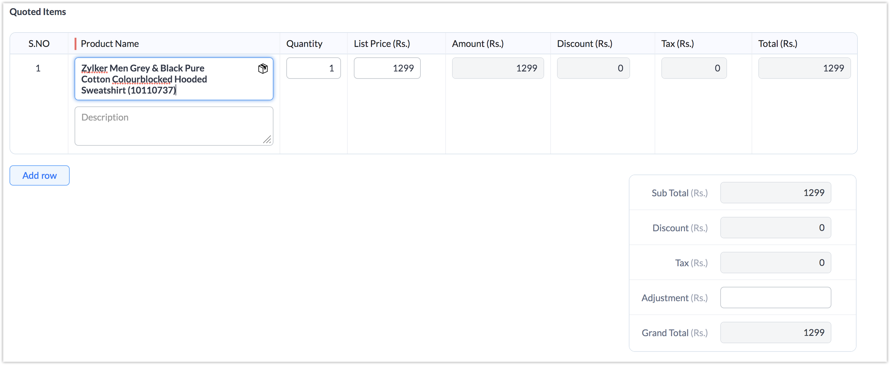De exemplu, presupune că adaugi același produs de bază "Zylker Wall Clock" ca trei elemente de linie diferite, câte unul pentru fiecare culoare, pe care intenționezi să le notezi în descriere. Unul albastru, negru și gri — deci decizi să adaugi același produs de trei ori, notând doar detaliul culorii ca descriere. Dar în acest caz, actualizarea dinamică a cantității va fi efectuată doar pentru primul element de linie care se potrivește și nu pentru celelalte două.