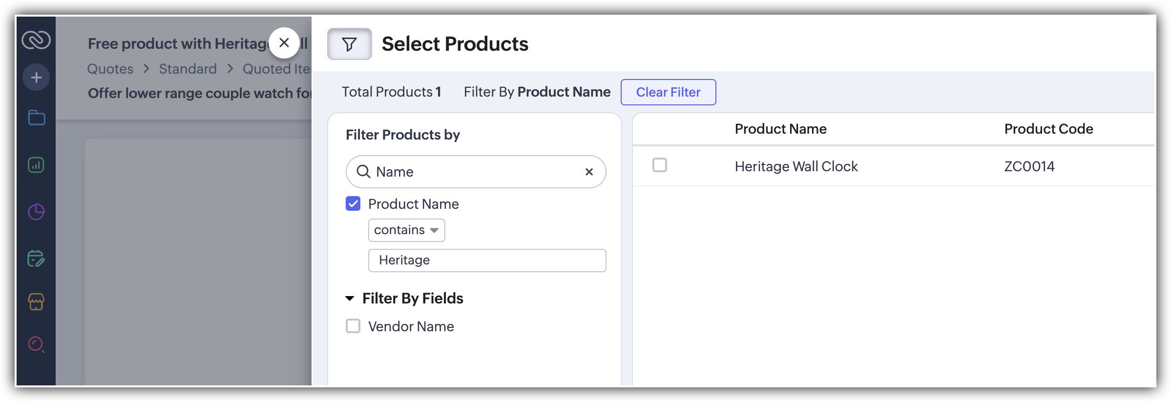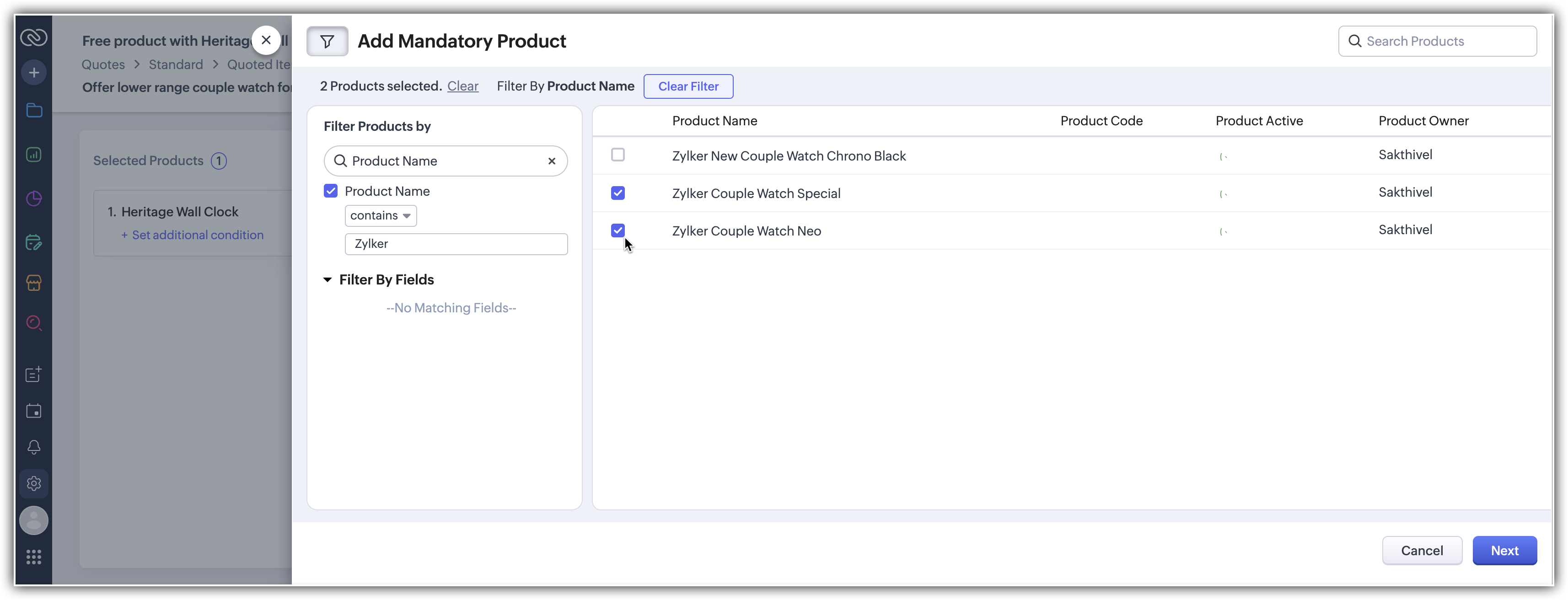 Să presupunem că Zylker Watches comercializează ceasuri de la gama medie la cele scumpe, inclusiv ceasuri de perete, ceasuri de mână, ceasuri smart și altele. La achiziția unui ceas de perete heritage scump, doresc să auto-sugereze articole suplimentare - adică un pachet anual de reparații, baterii potrivite, precum și ceasuri de mână suplimentare. Acest lucru poate ajuta reprezentanții de vânzări să facă cross-sell pentru aceste produse relevante și conexe. Acum, dacă sugestia a funcționat și clientul dorește să adauge aceste produse sugerate, reprezentanții de vânzări pot selecta direct în bloc articolele necesare și le pot adăuga direct la ofertă în bloc.
