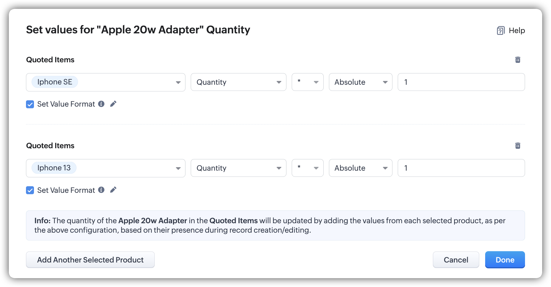 În acest caz, pentru fiecare iPhone, se adaugă 1 adaptor. Dacă se adaugă un total de 5 iPhone-uri, se adaugă 5 adaptoare (cantitatea înmulțită cu numărul absolut 1). - Apasă Done și Save pentru a salva regula.