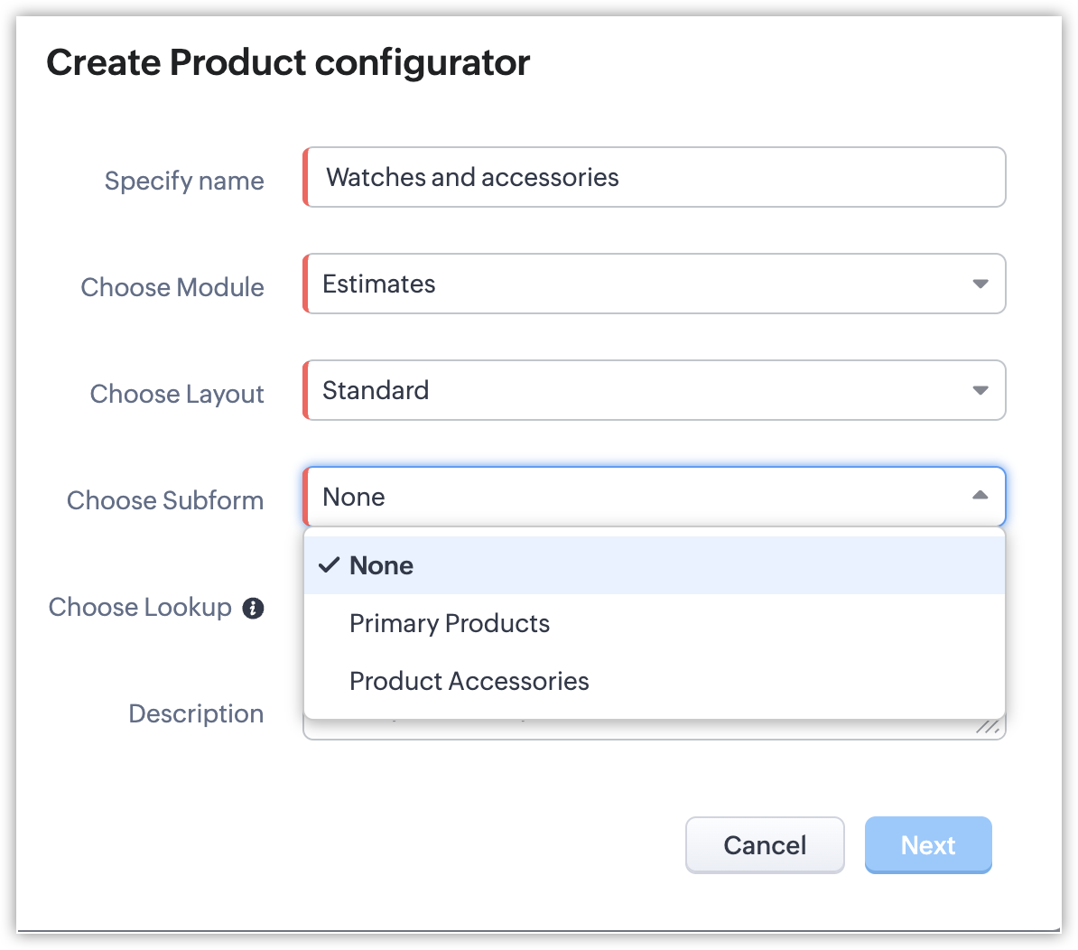 De exemplu, să presupunem că Zylker Watches își menține ofertele într-un modul personalizat numit Estimates și a organizat elementele de linie în două sub-formulare — Primary Products și Product Accessories. În acest caz poți crea reguli CPQ pentru Estimates și apoi să alegi sub-formularul necesar și să procedezi la crearea regulilor.