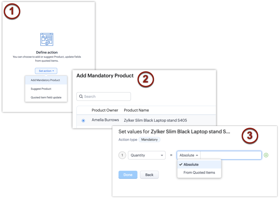 - Definește acțiunea necesară: Exemplu, Adaugă produs obligatoriu, Zylker Slim Black Laptop Stand S405.