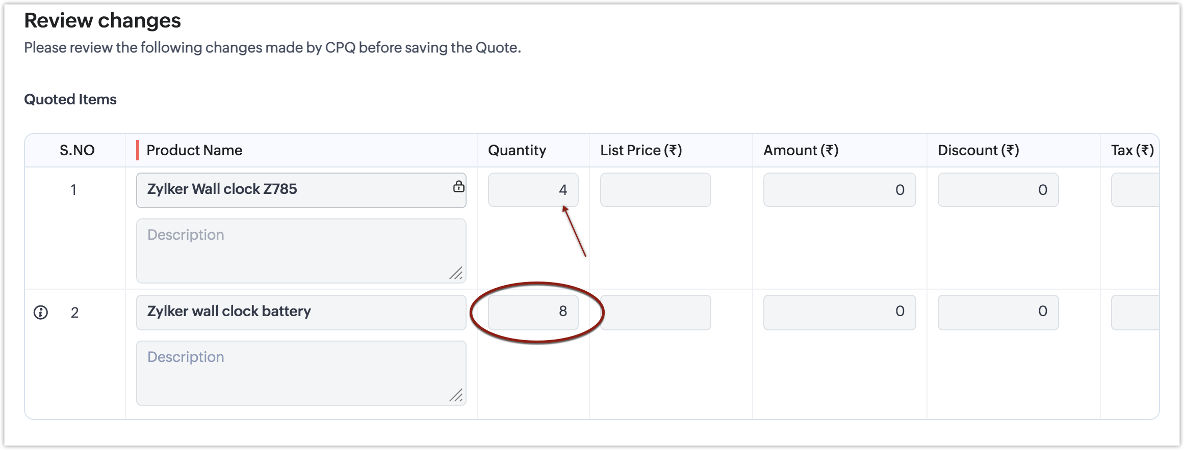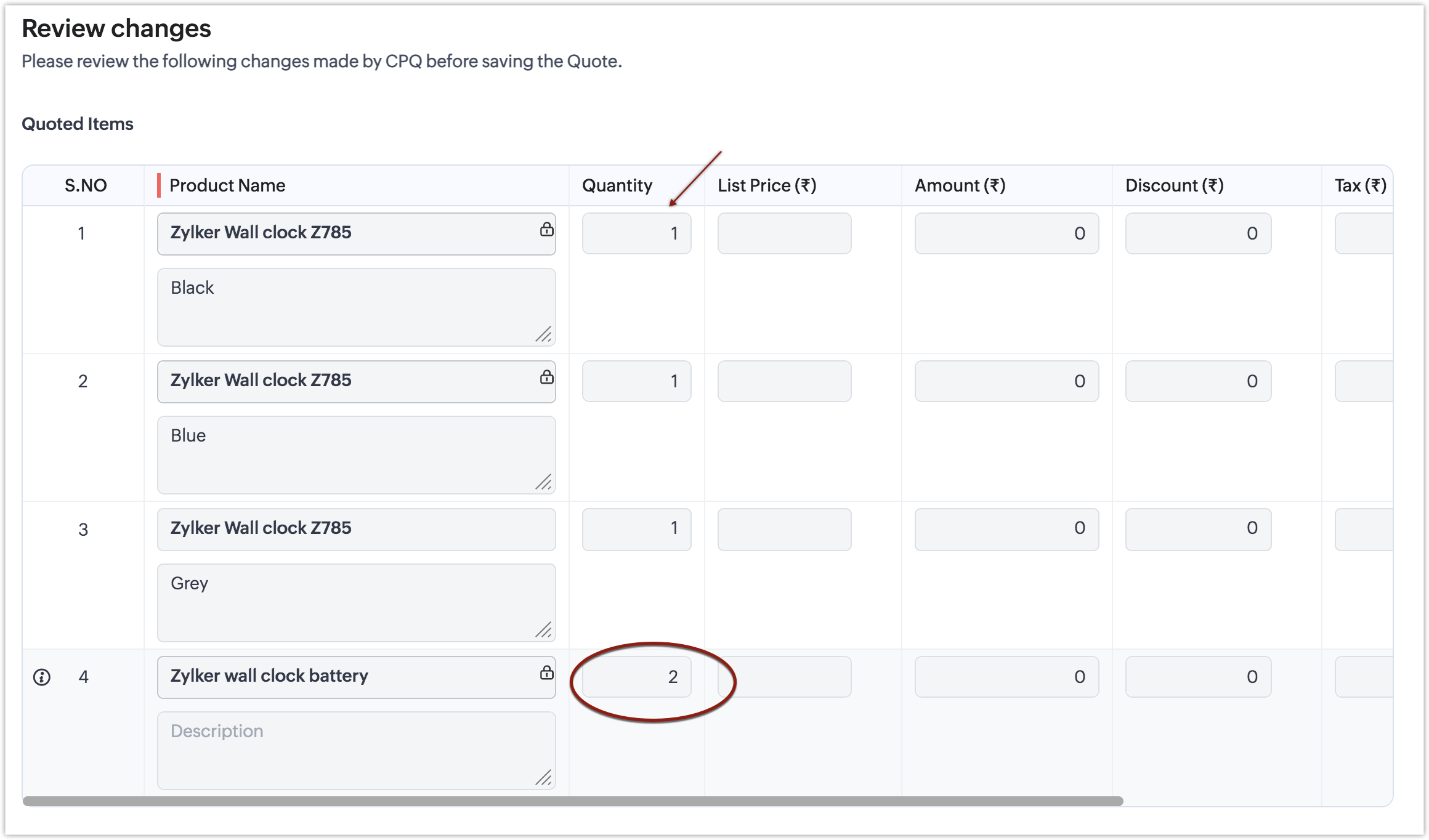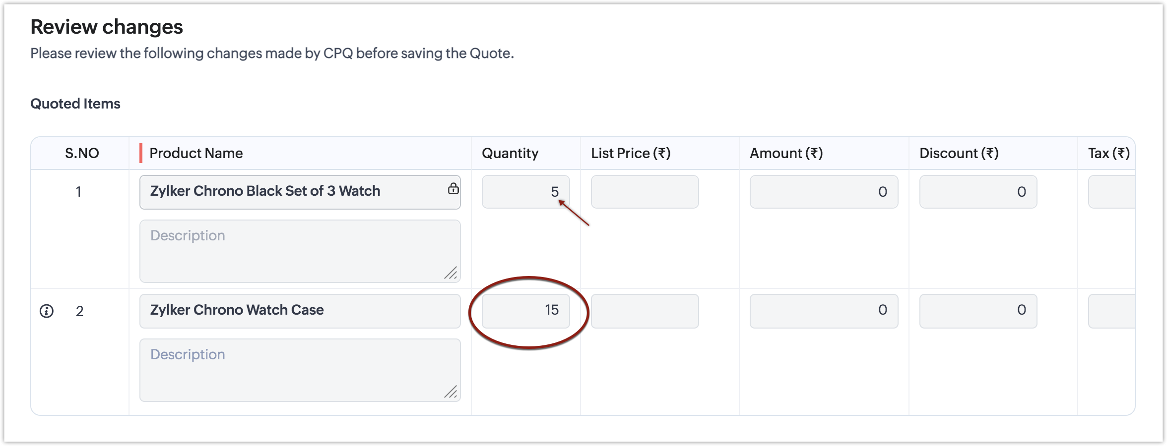 - În prezent, CPQ calculează valoarea cantității dinamice doar pentru primul produs care se potrivește din lista de elemente de linie, dacă același produs de bază este adăugat pe mai multe elemente de linie. Adică, dacă adaugi același produs "Zylker Couple watch" pe mai mult de un element de linie, actualizarea dinamică a cantității se execută doar pentru prima instanță a produsului și nu pentru intrările ulterioare.