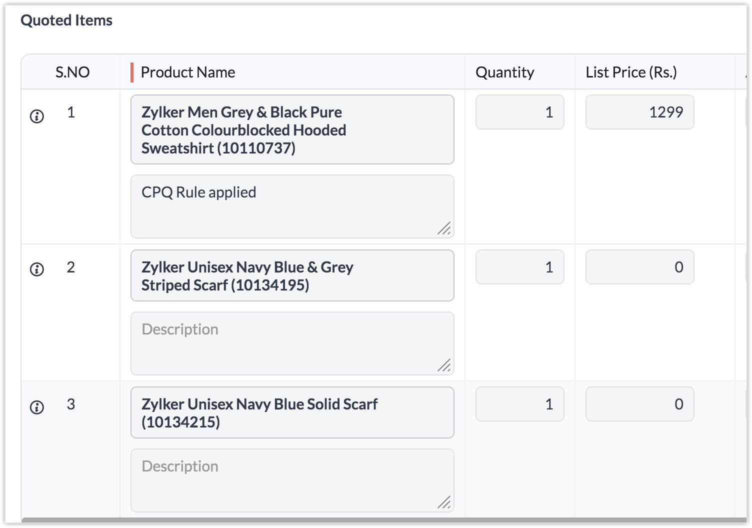 Să presupunem că Zylker Apparel are o lichidare de sfârșit de an în care, dacă un client comandă un hanorac specific, un fular asortat se adaugă gratuit la elementele de linie. Pentru a face din aceasta o practică consistentă în cadrul organizației, astfel încât echipele de vânzări să nu rateze această acțiune, această practică poate fi configurată în sistemul CPQ sub "Product Configurator".