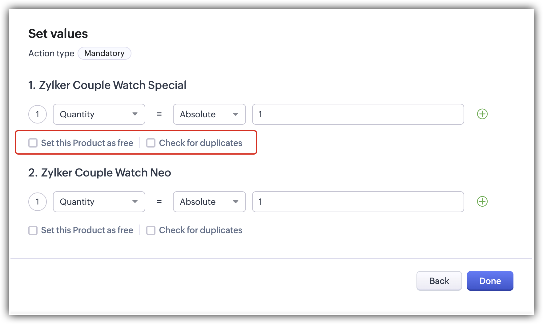 Pasul 2 — Selectează opțiunile de ceas de cuplu ca produs obligatoriu sub acțiunile selectatePasul 3: Bifează caseta "Set this Product as free" și actualizează cantitatea ca număr absolut sau din Quoted Items.