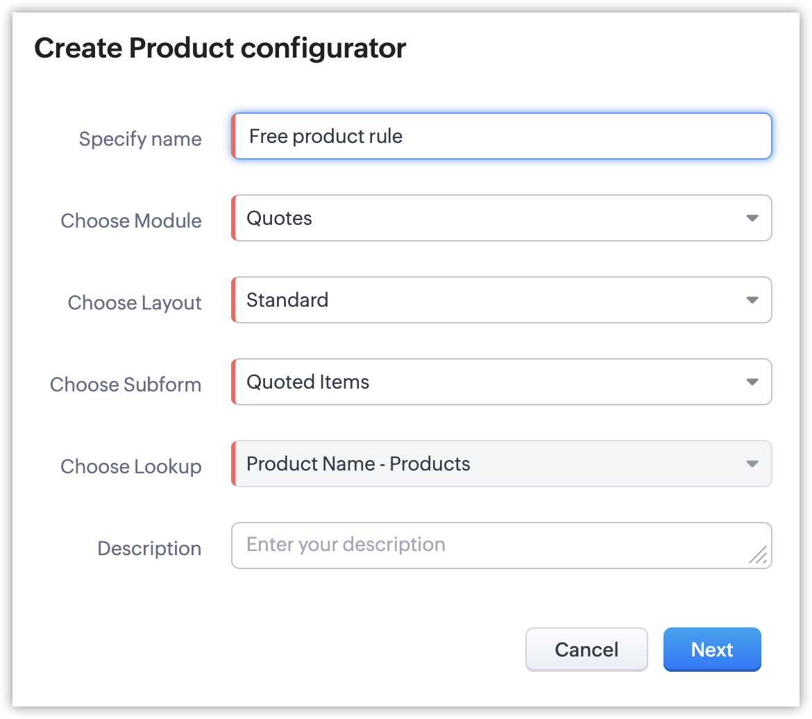 Regulile CPQ pot fi create pentru orice modul și orice sub-formular din cadrul acelui modul, cu cel puțin un câmp de tip lookup. Tot ce trebuie să faci este să alegi modulul, sub-formularul și câmpul de tip lookup pentru care regulile trebuie executate.