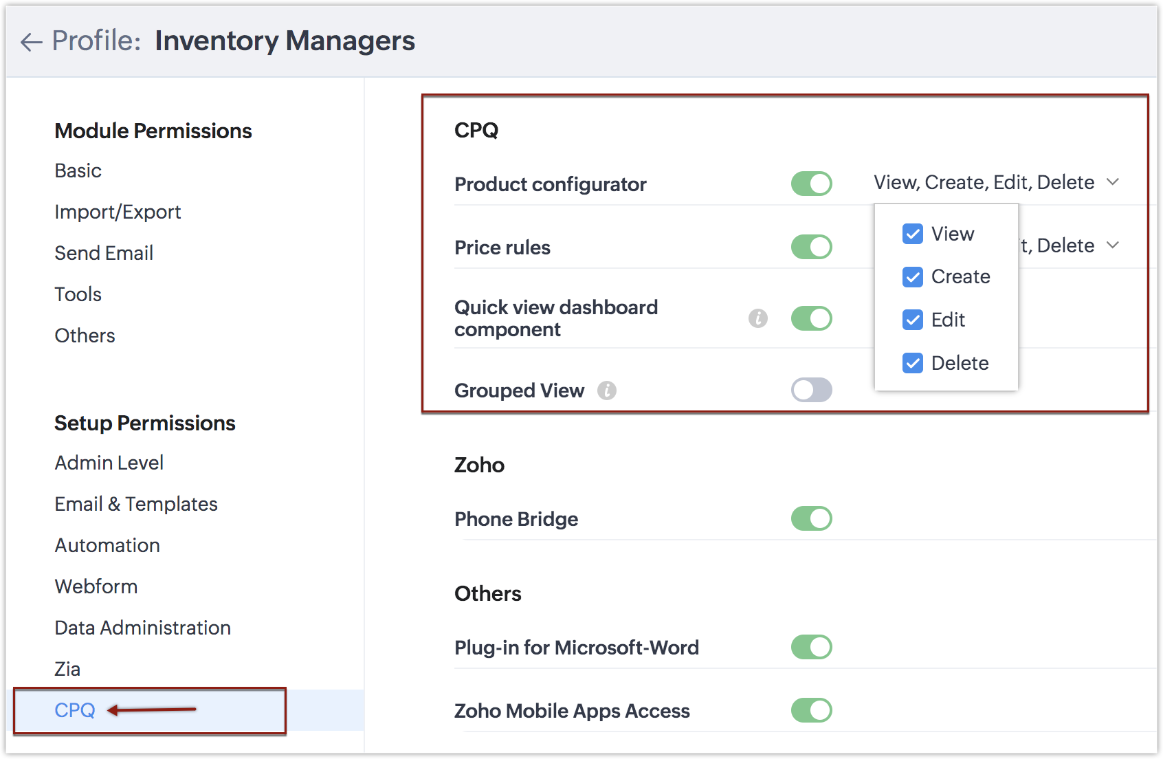Un Administrator poate decide dacă un anumit profil are nevoie de Vizualizarea grupată în CPQ pentru utilizarea CRM. Adică, în calitate de administrator, poți decide dacă vrei ca echipa ta de inventar să folosească vizualizarea grupată CPQ sau nu.