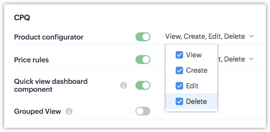 Acest set de permisiuni determină dacă utilizatorul poate să Creeze, Vizualizeze, Editeze sau Șteargă diferitele combinații de produse și reguli de preț configurate în CPQ.