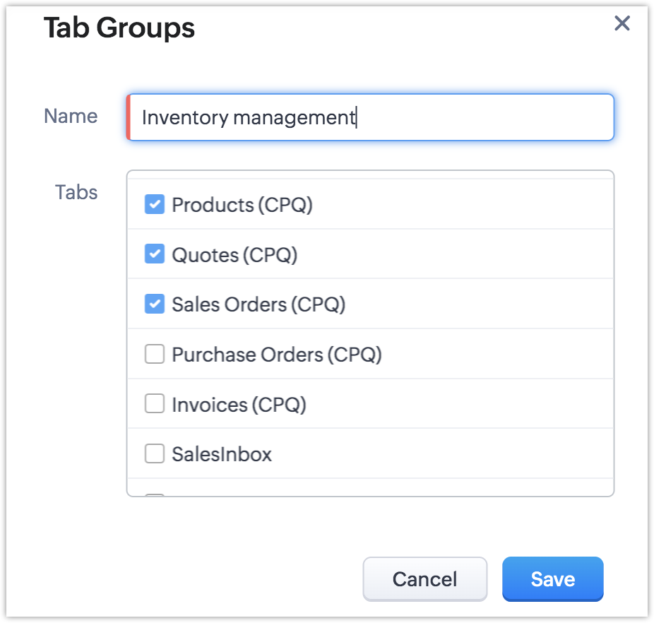 2. Dacă creezi un Grup de file cu module de inventar în timp ce Vizualizarea grupată este activată pentru CPQ, va trebui să adaugi fiecare modul, adică Produse, Oferte etc., în grupul de file unul câte unul. Acest lucru se datorează faptului că pot exista situații în care vrei să grupezi anumite file, cum ar fi Oferte, Comenzi de achiziție, Comenzi de vânzare și Factură, dar să excludi Liste de prețuri și Produse din grupul tău de file. Dacă CPQ ca grup pre-combinat este adăugat integral, este posibil să nu poți exclude modulele nedorite chiar dacă vrei. Prin urmare, pentru a indica faptul că aceste module sunt grupate, există o etichetă "(CPQ)" lângă fiecare modul participant, astfel încât să fii conștient că creezi un Grup de file în timp ce Vizualizarea grupată este activată pentru contul tău.