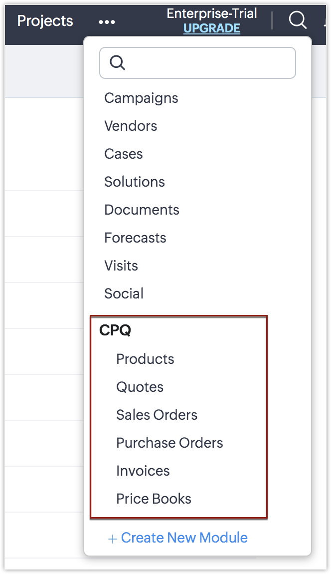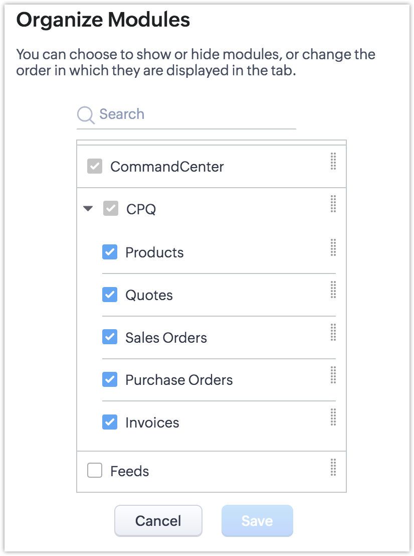 1. Dacă setarea Vizualizare grupată este activată în setările CPQ, sub Module și câmpuri > Organizare module, toate cele 6 module grupate (Oferte, Comenzi de vânzare, Comenzi de achiziție, Factură, Liste de prețuri și Produse) vor fi afișate ca grupate sub modulul părinte CPQ.