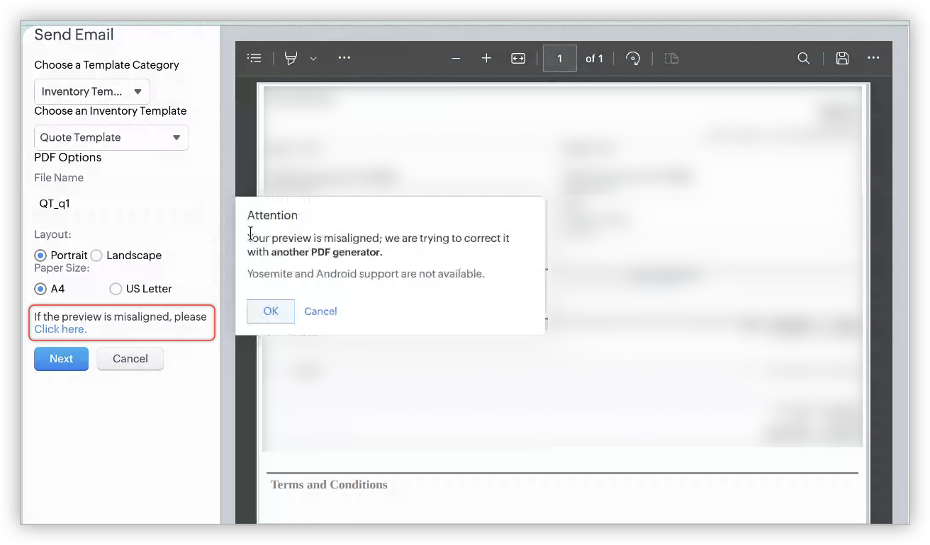 Acest upgrade se aplică doar organizațiilor care folosesc vechiul generator PDF. Zoho CRM va notifica acești utilizatori printr-un banner în aplicație, pe pagina Șabloane de inventar și în timpul generării PDF-urilor.
