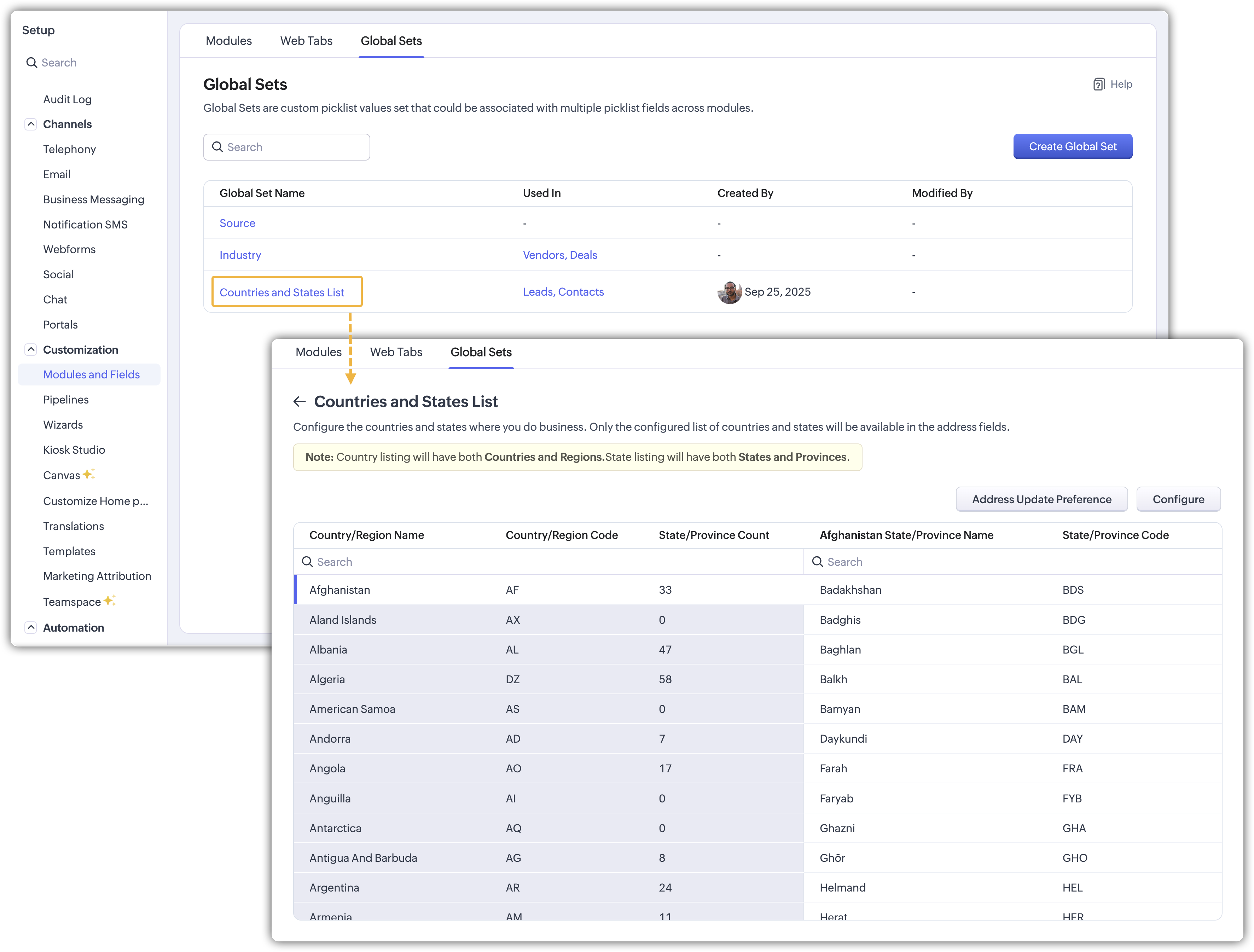Dacă afacerea ta operează în regiuni specifice, poți controla și lista. De exemplu, ai putea dori să afișezi doar un set limitat de țări în care operezi sau să adaugi valori personalizate pentru județe din regiunile pe care le deservești. Această flexibilitate este gestionată prin Global Sets în Setup.