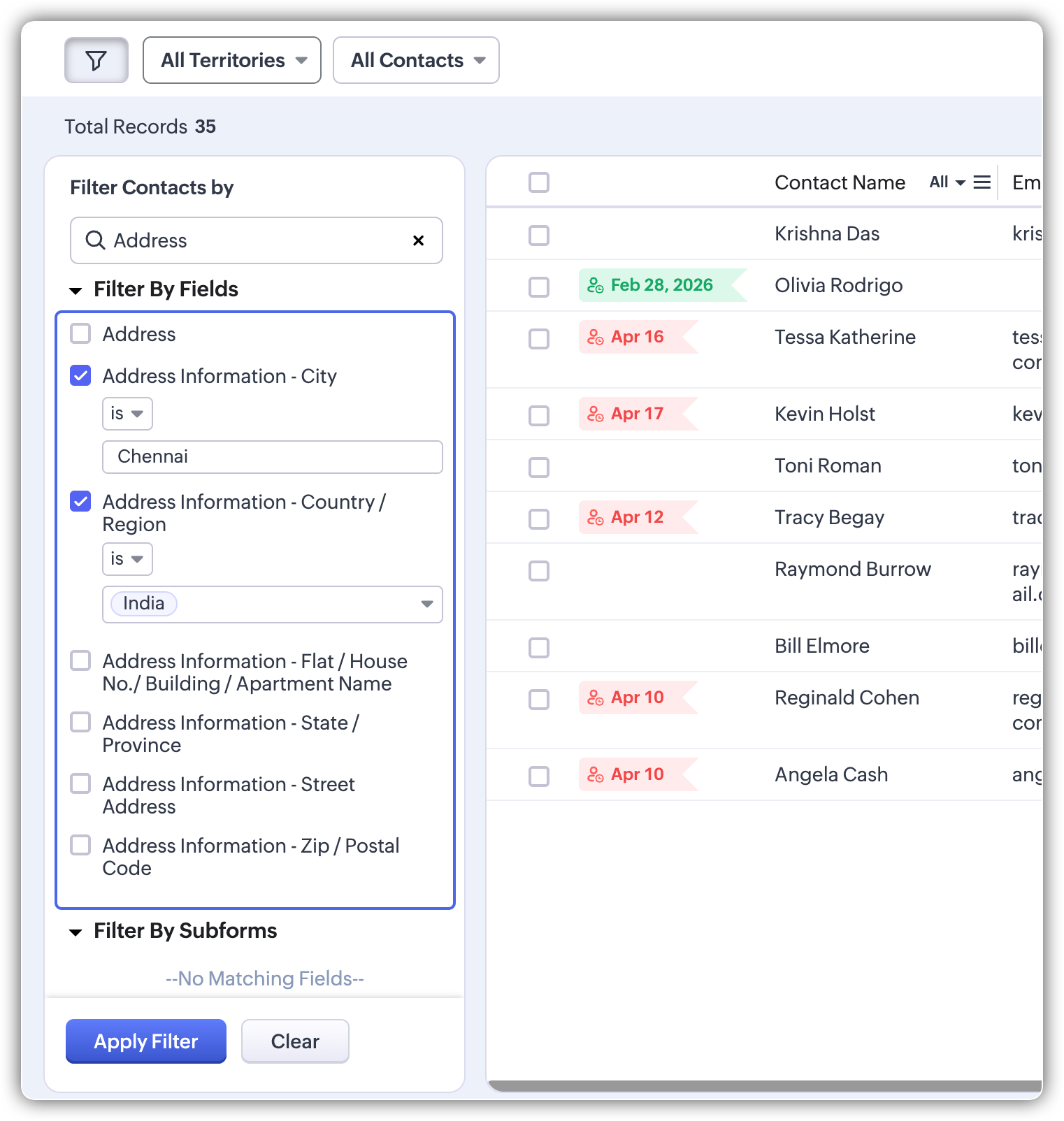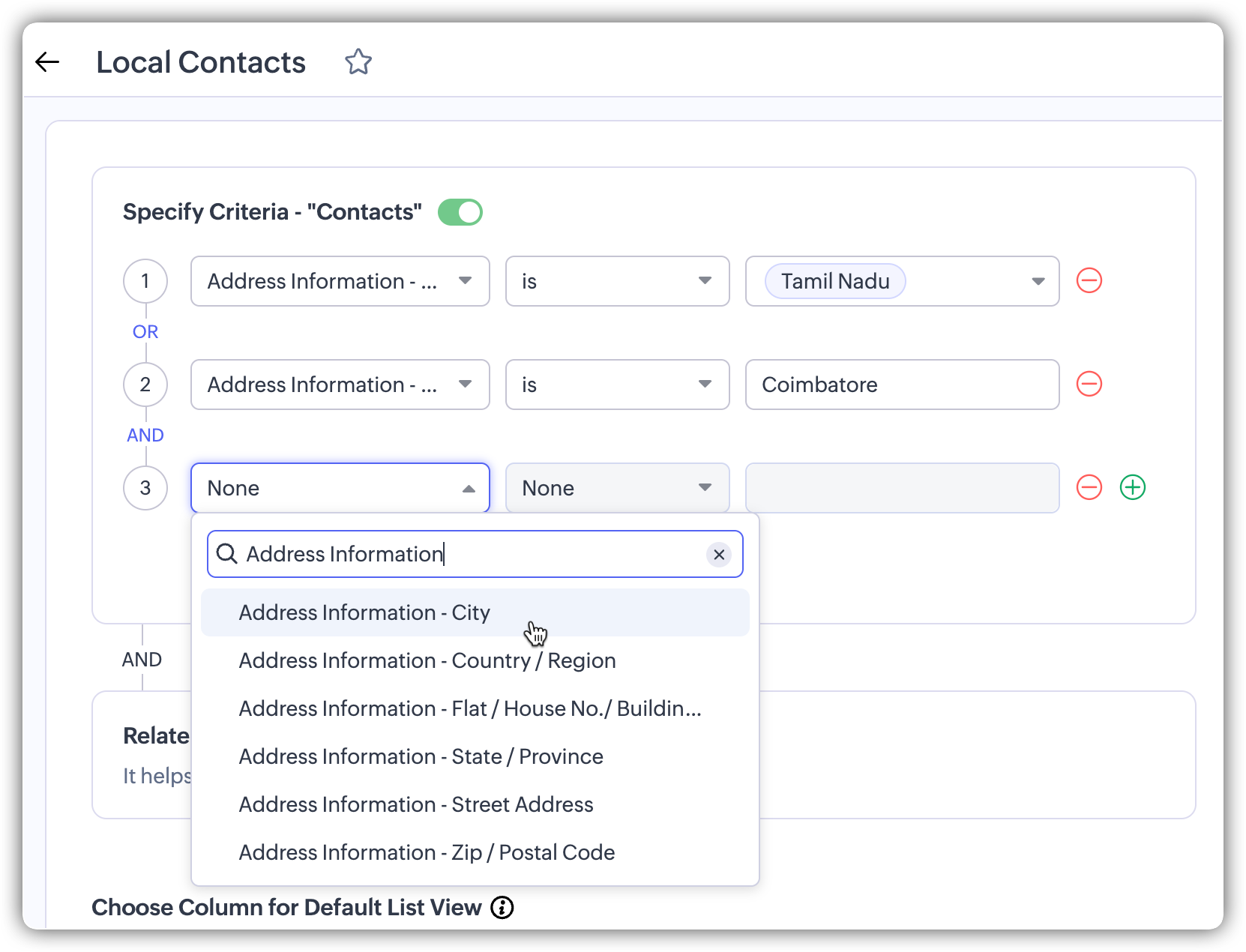 Similar, poți construi o vizualizare personalizată pentru a lista lead-urile din Chennai sau Coimbatore din Tamil Nadu, ajutând echipele regionale să se concentreze pe follow-up-uri specifice locației.