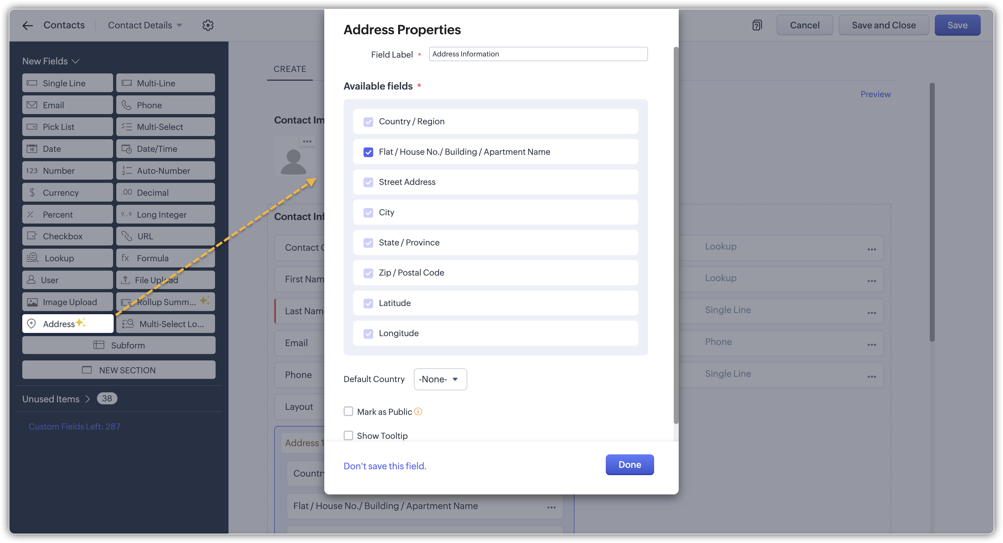 - Selectează celelalte opțiuni pentru a marca câmpul ca public și/sau pentru a afișa un tooltip.