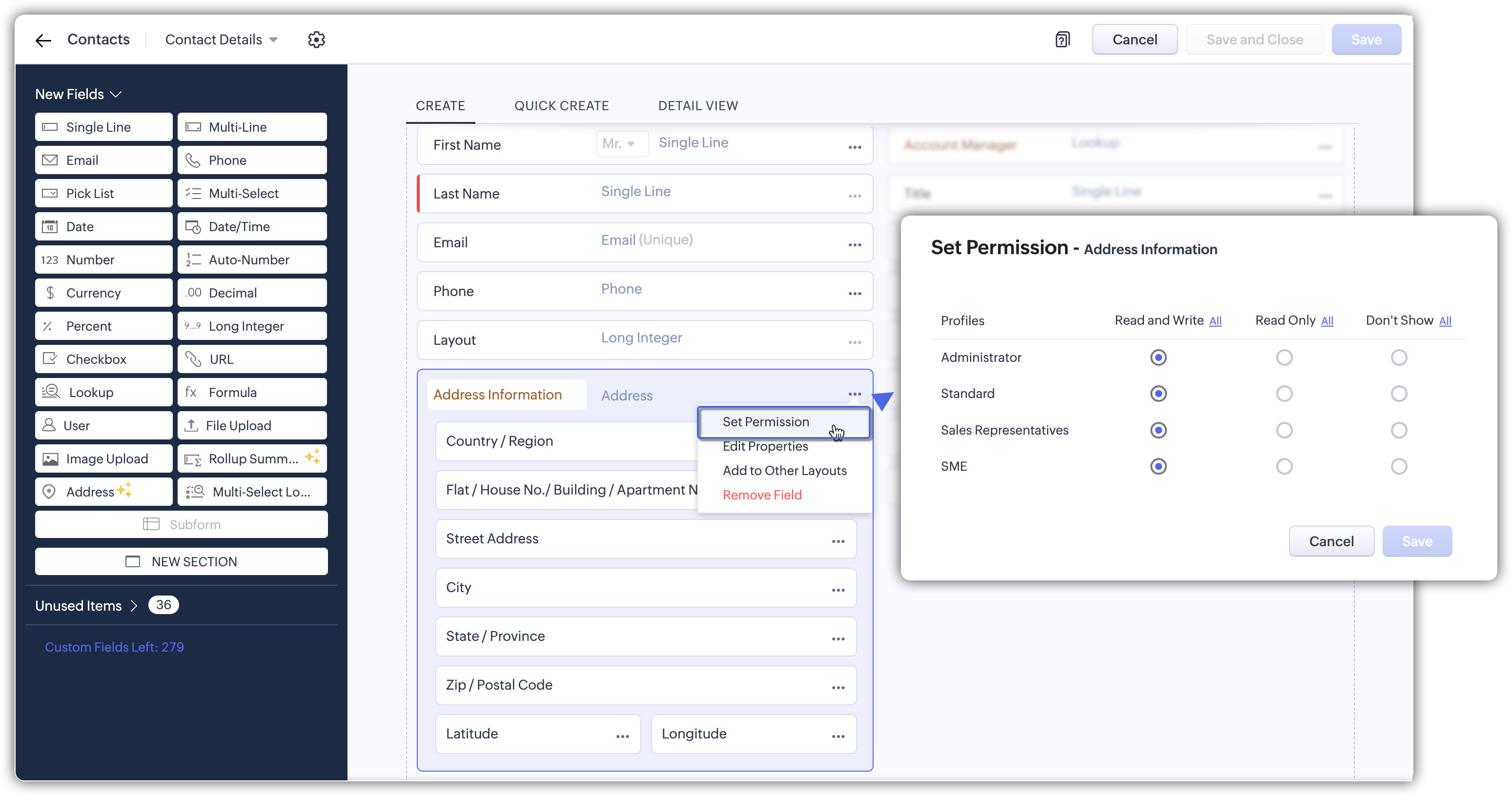 - Poți atribui permisiuni de acces întregului Câmp de Adresă în funcție de profilurile utilizatorilor.