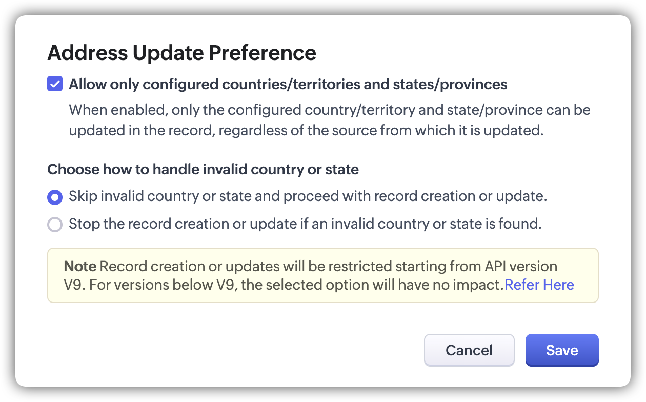 Notă: Crearea sau actualizarea înregistrărilor va fi restricționată începând cu versiunea API V9. Pentru versiunile inferioare V9, opțiunea selectată nu va avea niciun impact.