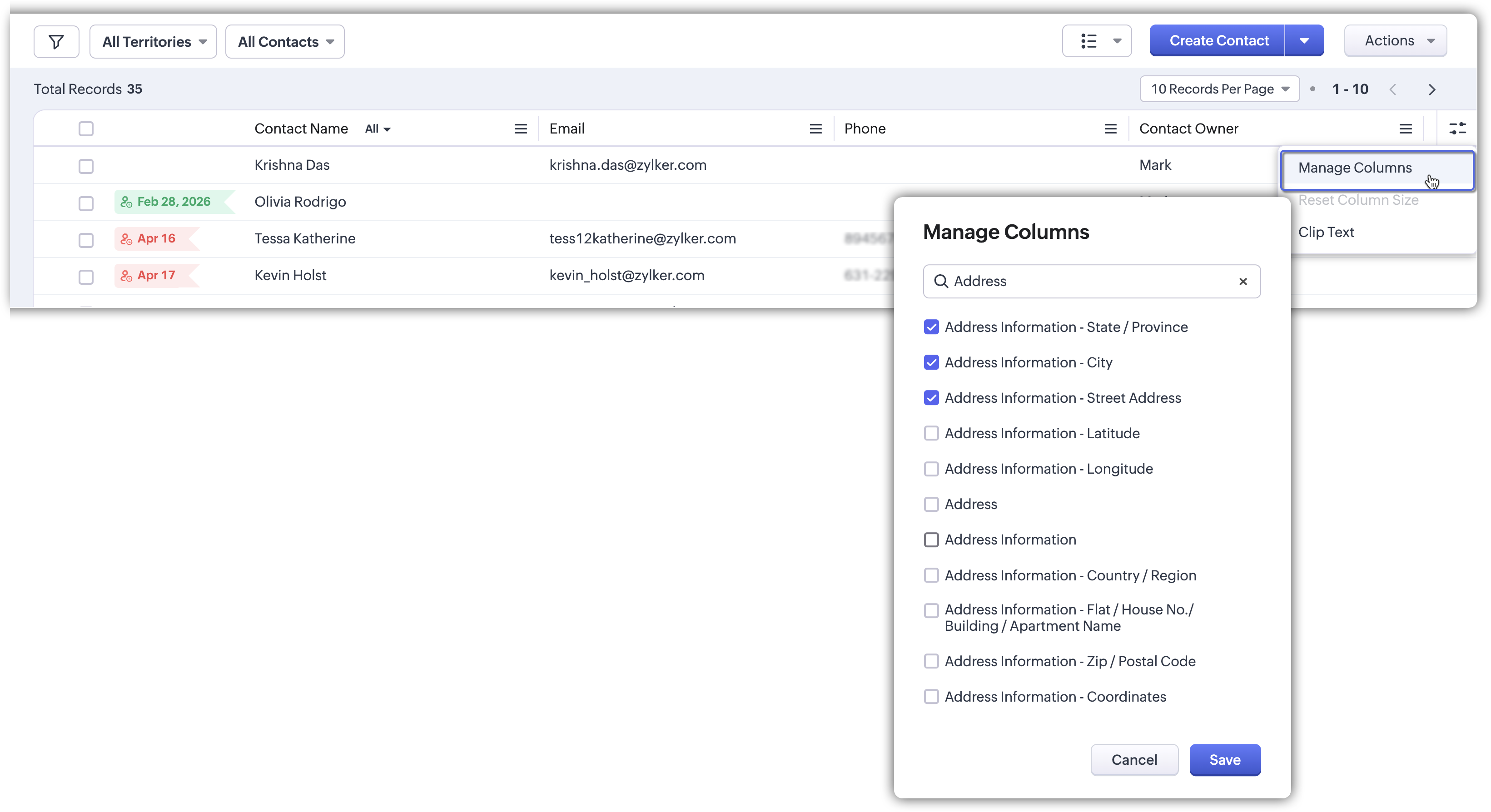 - Vizualizări: În orice vizualizare unde sunt afișate înregistrări—List View, Kanban View, Grid View, Rapoarte, Tablouri de bord sau Liste asociate—utilizatorii pot alege să afișeze detaliile de adresă. Din opțiunea Manage Columns, poți afișa fie întregul câmp de Adresă, fie poți adăuga doar anumite părți, cum ar fi Orașul, Țara sau Codul Poștal.