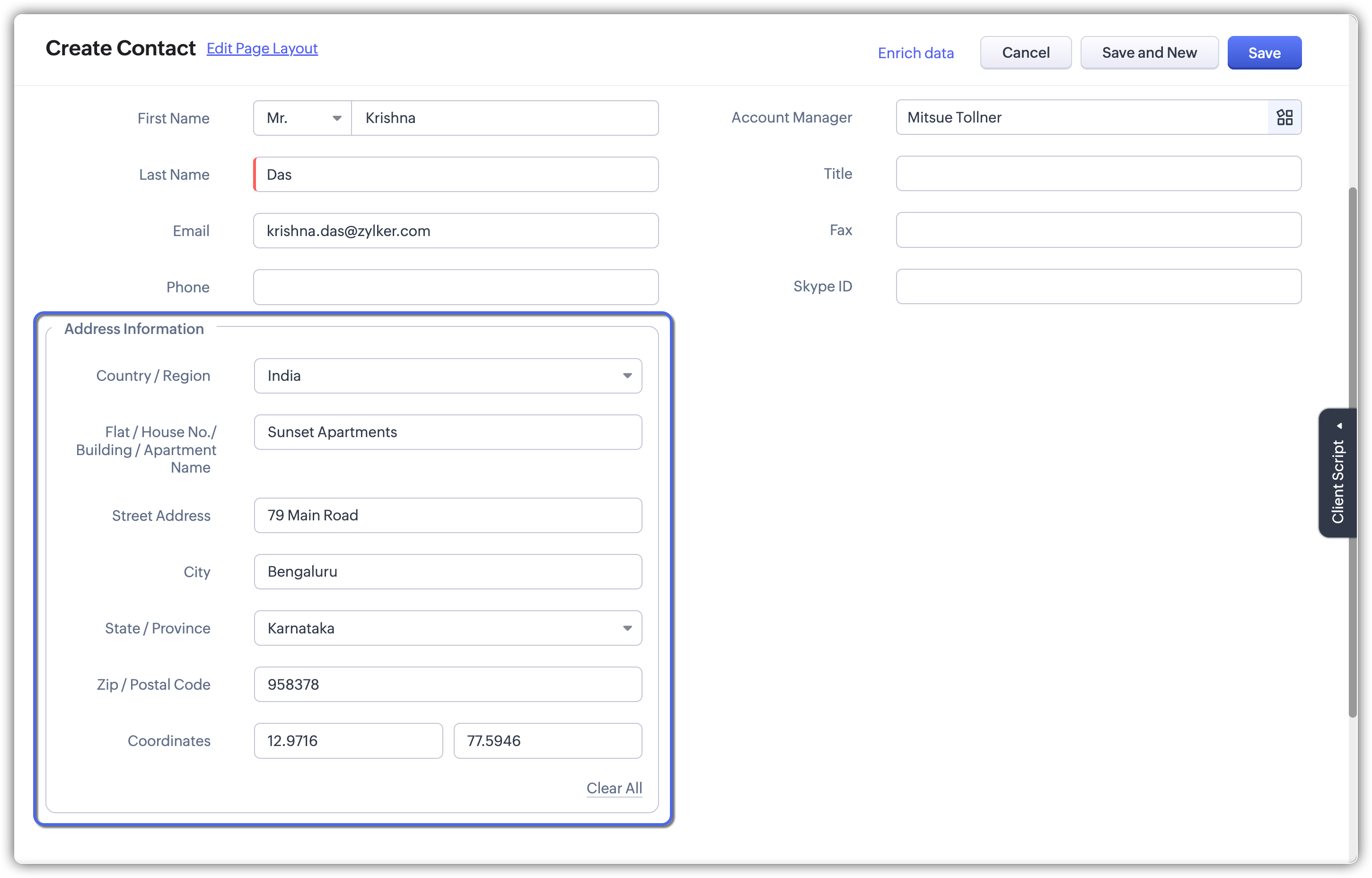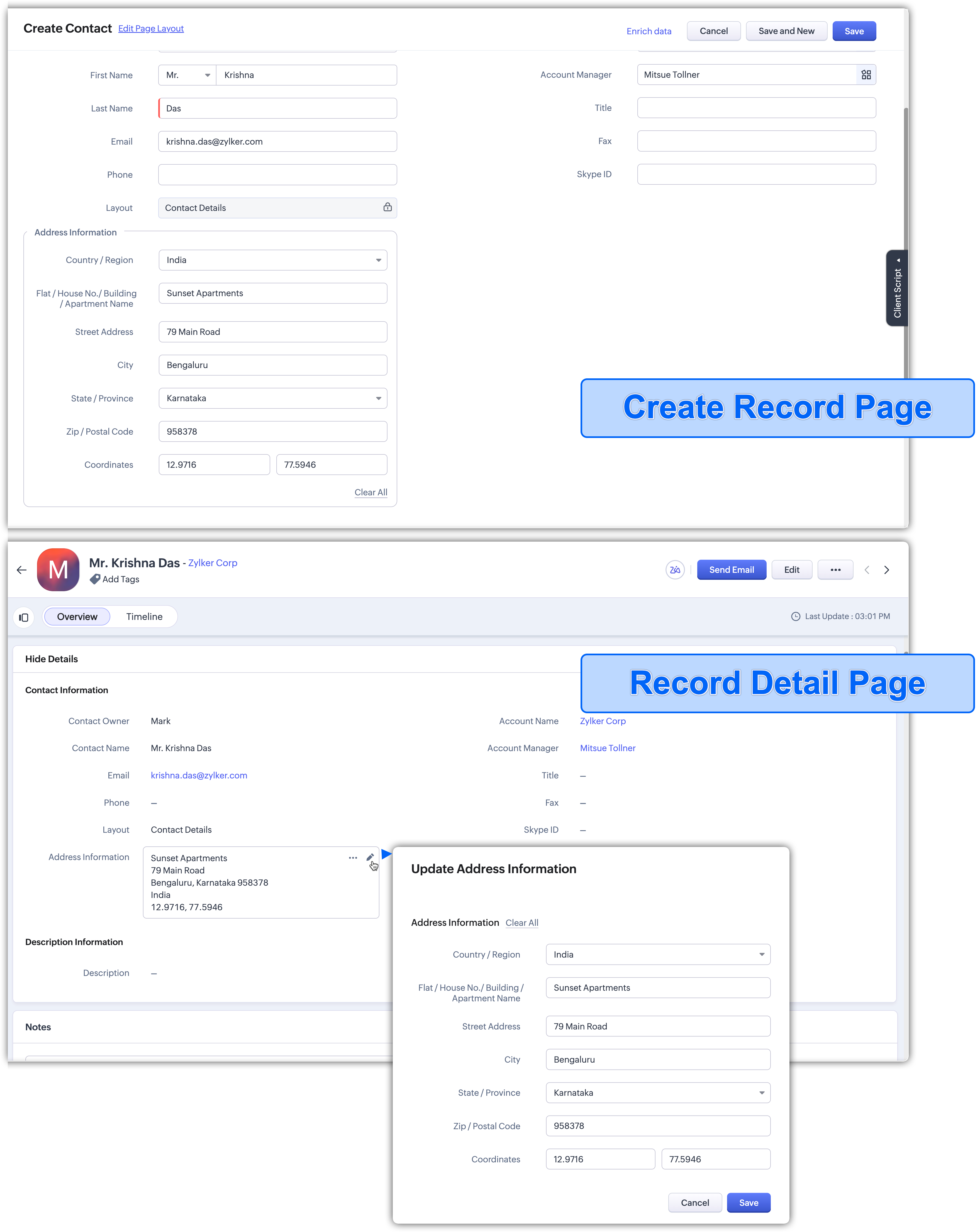 - Pe paginile de detalii ale înregistrărilor, apare ca un bloc formatat ordonat. Utilizatorii pot face clic pe pictograma creion pentru a actualiza adresa, unde toate sub-câmpurile sunt editabile într-un pop-up.