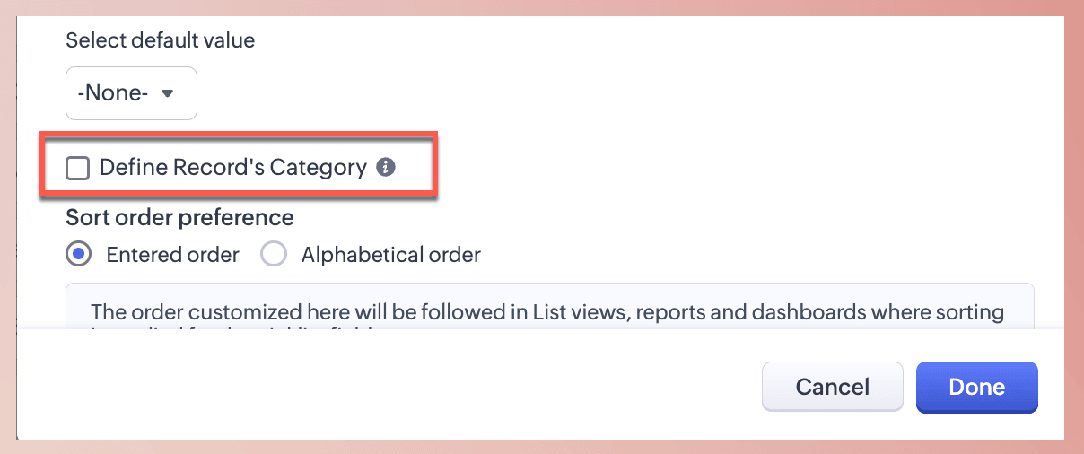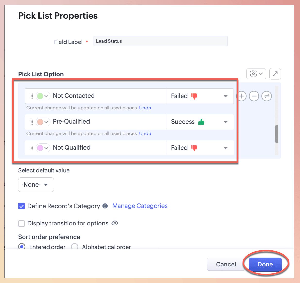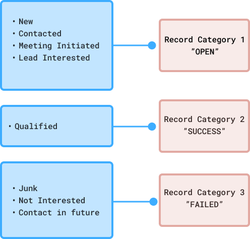 În scenariul de mai sus, pentru opțiunile de Lead Status, există o grupare comună: am văzut că utilizatorul a configurat categoria de înregistrare pentru câmpul de tip picklist Lead Status. Fiecare valoare existentă a fost apoi mapată la una dintre aceste categorii în funcție de rezultatul său. Utilizatorii pot vedea aceasta și pot deduce statusul înregistrărilor. În plus, utilizatorii pot vizualiza, filtra și acționa asupra înregistrărilor pe baza acestor categorii, folosind Record Category — despre care vei afla mai jos în detaliu.