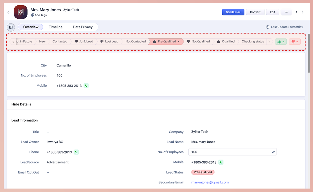 Să luăm un exemplu pentru a înțelege categoria de înregistrare. În modulul Leads, câmpul Lead Status captează etape detaliate precum New, Contacted, Lost, Unqualified, Qualified, Junk etc. Deși aceste valori oferă profunzime, înțelegerea stării generale a unui lead necesită adesea examinarea înregistrărilor individuale sau a coloanelor de status din vizualizările listei. Totuși, vizualizarea progresului lead-ului la nivel înalt sau înțelegerea stării generale a unei înregistrări dintr-o privire rămâne o provocare.