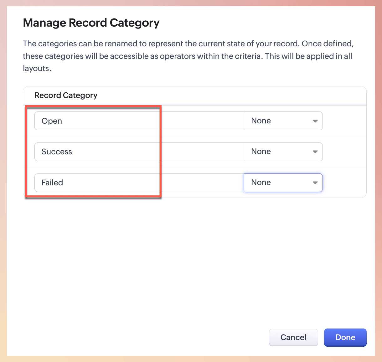 Pentru a realiza acest lucru, utilizatorul trebuie să activeze Define Record Category. Procedând astfel, utilizatorul poate defini categoriile implicite Open, Success, Failed sau orice categorii personalizate.