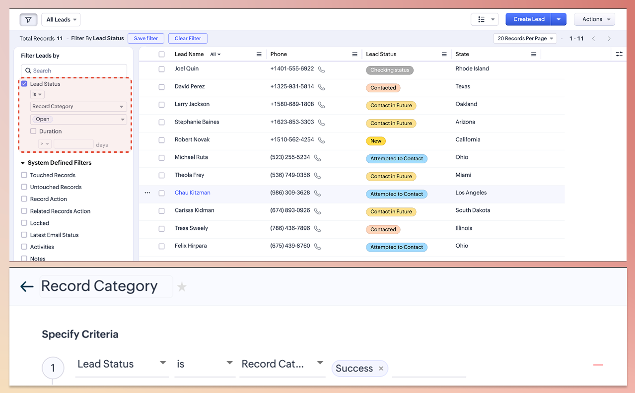 Categoria de înregistrare simplifică acest lucru, permițându-ți să grupezi valorile aferente câmpului Lead Status în categorii mai largi. Astfel, obții o vizualizare consolidată a înregistrărilor similare, poți înțelege instantaneu situația unui lead și navighezi și acționezi mai rapid, fără să pierzi accesul la informațiile detaliate despre status.