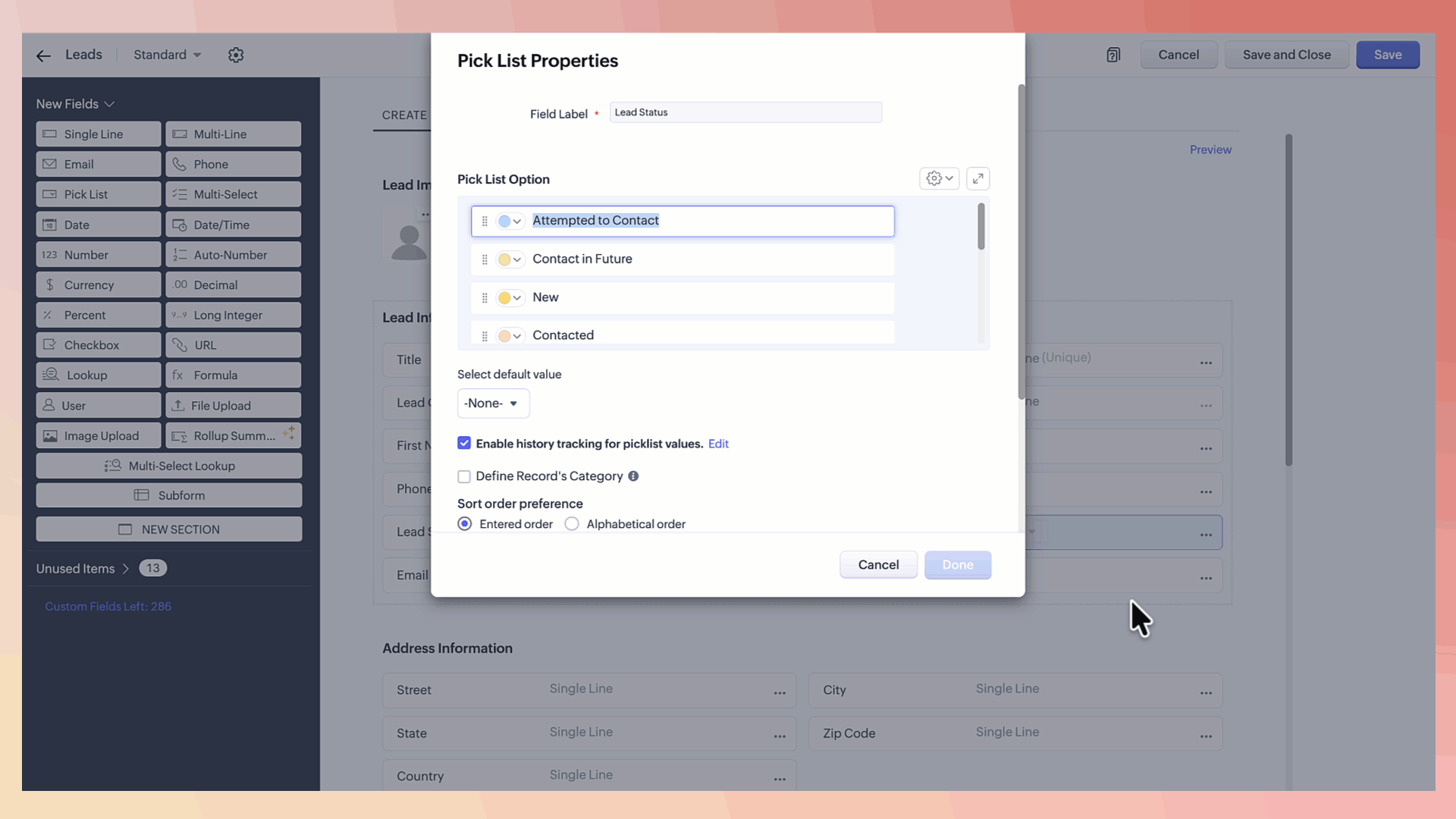 Navighează la modulul dorit > Create/edit un câmp de tip picklist.