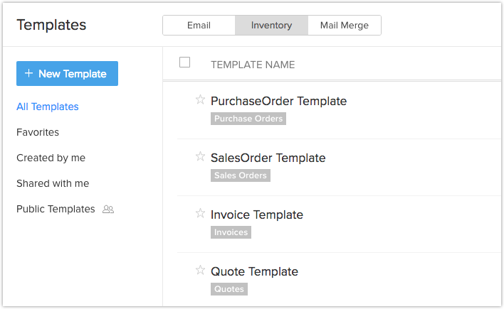 Poți crea șabloane de inventar pentru a trimite oferte de preț personalizate, comenzi de vânzare, facturi și comenzi de achiziție clienților și furnizorilor tăi. Șabloanele de inventar în Zoho CRM pot fi create ușor folosind următoarele metode.