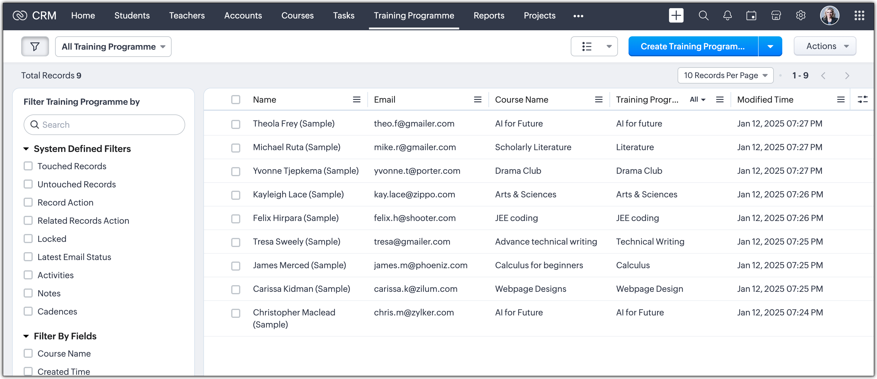 4. Instituții de educație: Folosește un modul personalizat pentru a gestiona procese educaționale precum programe de formare, progresul studenților și feedback-ul la cursuri. Highland School of Business Management, care folosește Zoho CRM pentru operațiunile sale educaționale, poate beneficia enorm de această funcționalitate. Prin crearea de module personalizate, pot eficientiza procesele legate de profesori, studenți, cursuri și programe de formare. De exemplu, pot menține înregistrări organizate pentru lista lor de profesori, studenți și cursuri. În plus, modulele personalizate le permit să planifice, organizeze și urmărească eficient programele de formare atât pentru studenți, cât și pentru profesori, asigurând un management fluid al inițiativelor lor educaționale.
