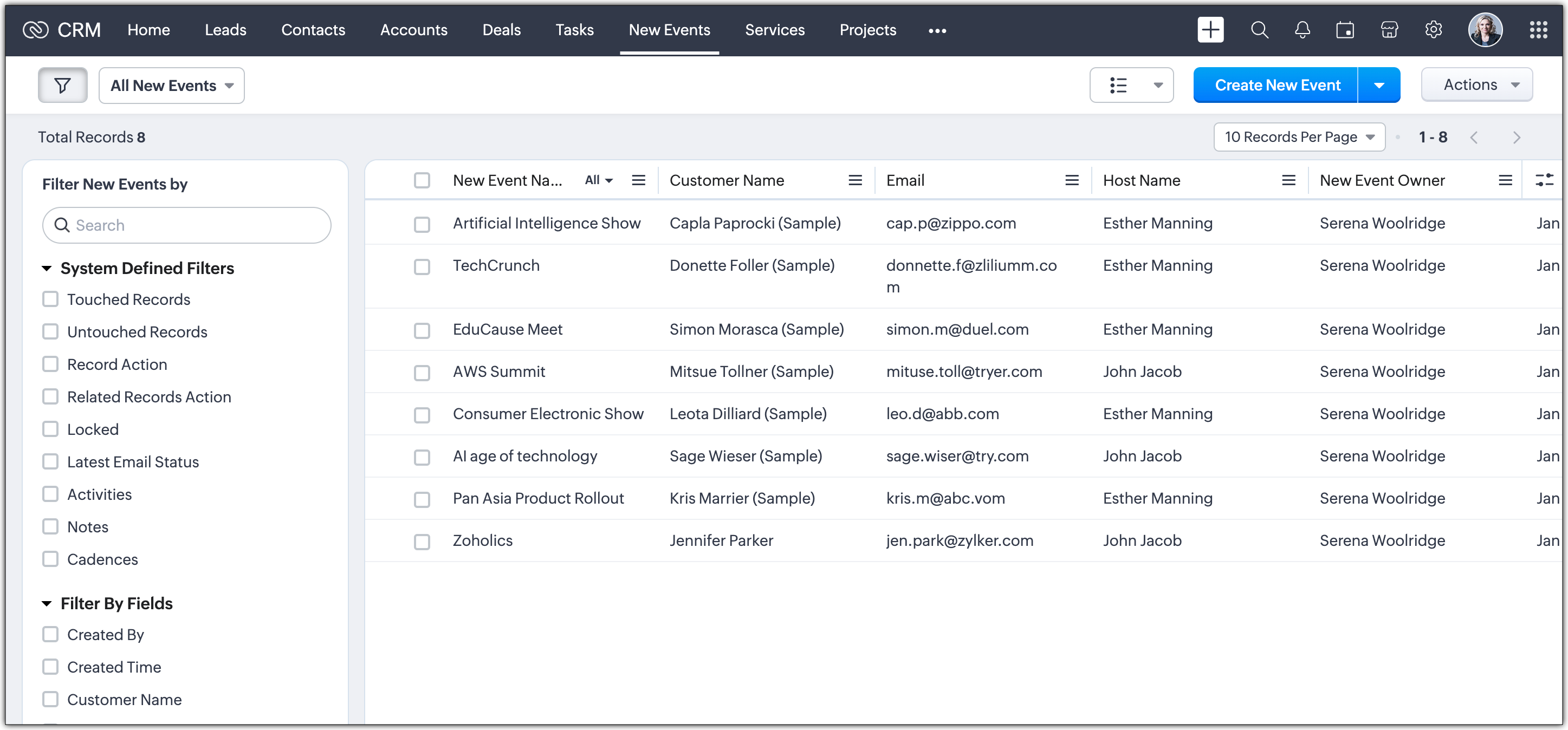 3. Managementul evenimentelor: Dezvoltă un modul pentru a planifica și urmări evenimente, inclusiv participanți, programe și rezultate. De exemplu, Sun Media House, cu sediul în California, servește clienți din medii diverse ajutându-i să organizeze evenimente pentru diverse ocazii. Se bazează pe Zoho CRM pentru a gestiona eficient relațiile cu clienții. Cu evenimente programate pe tot parcursul anului, este esențial pentru ei să se asigure că fiecare eveniment este bine planificat și executat fără probleme. Prin crearea unui modul personalizat numit „Evenimente noi", pot urmări progresul planificării evenimentelor, inclusiv programarea, înregistrările și detaliile gazdei, asigurând un management eficient al evenimentelor.