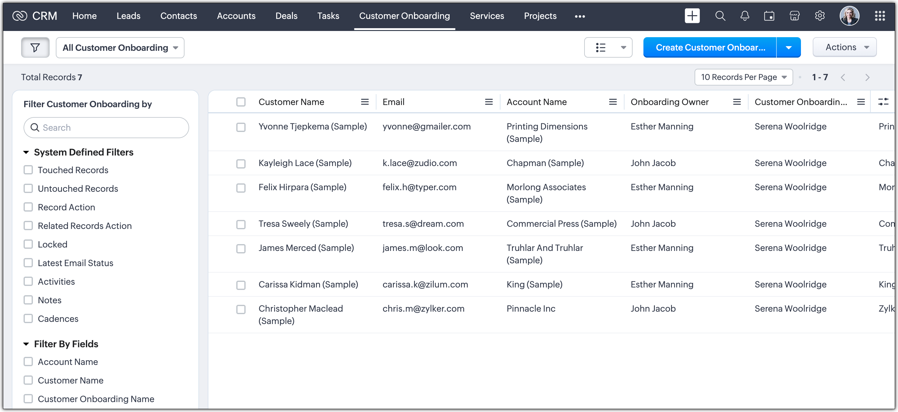 2. Integrarea clienților: Urmărește parcursul de integrare al noilor clienți, asigurând că toți pașii necesari sunt finalizați eficient. Să luăm exemplul Zylker Enterprises, un start-up de software renumit pentru software-ul său de urmărire. Cu un volum mare de clienți noi care se înregistrează pentru conturi, aceștia au nevoie de o modalitate eficientă de a gestiona cererile de integrare. Prin crearea unui modul personalizat numit „Integrarea noilor clienți", pot urmări și sprijini eficient clienții pe măsură ce încep să folosească software-ul, asigurând o experiență de integrare fluidă și fără probleme.