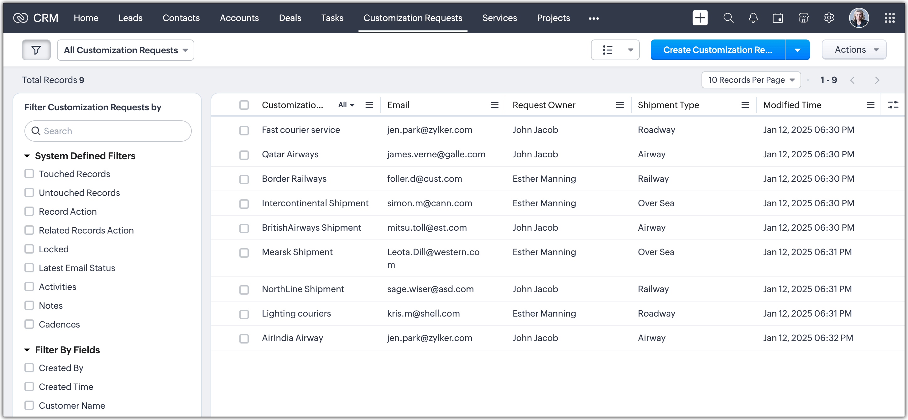 1. Cereri de personalizare a produselor: Creează un modul pentru a urmări și gestiona cererile clienților privind modificările de produs. Să zicem că ZylkerInc, un start-up specializat în software de urmărire pentru industria de transport maritim, folosește CRM pentru a-și gestiona afacerea. Pentru a satisface nevoile unice ale clienților lor bazate pe modurile de transport—cum ar fi rutier, aerian, maritim sau feroviar—aceștia își pot personaliza software-ul în consecință. Prin crearea unui modul personalizat intitulat „Cereri de personalizare", pot urmări și gestiona eficient cerințele specifice de personalizare transmise de clienții lor.