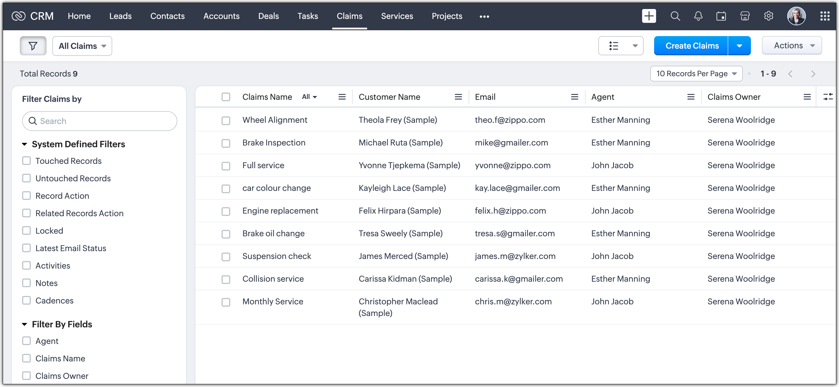5. Procesarea daunelor: Folosește un modul personalizat pentru a gestiona daunele de asigurare depuse de clienți. De exemplu, SafeHaven Insurance, o companie de asigurări auto cu sediul în Chennai, folosește Zoho CRM pentru a-și susține afacerea în creștere. Cu o bază mare de clienți și o varietate de polițe de asigurare care acoperă diferite scenarii, gestionarea eficientă a daunelor este crucială. Pentru a realiza acest lucru, pot crea un modul personalizat numit „Daune noi" pentru a înregistra și urmări daunele depuse de clienții lor. Acest modul le permite să atribuie fiecare daună unui agent pentru soluționare promptă și asigură că daunele sunt procesate eficient, oferind o experiență fără probleme clienților lor.