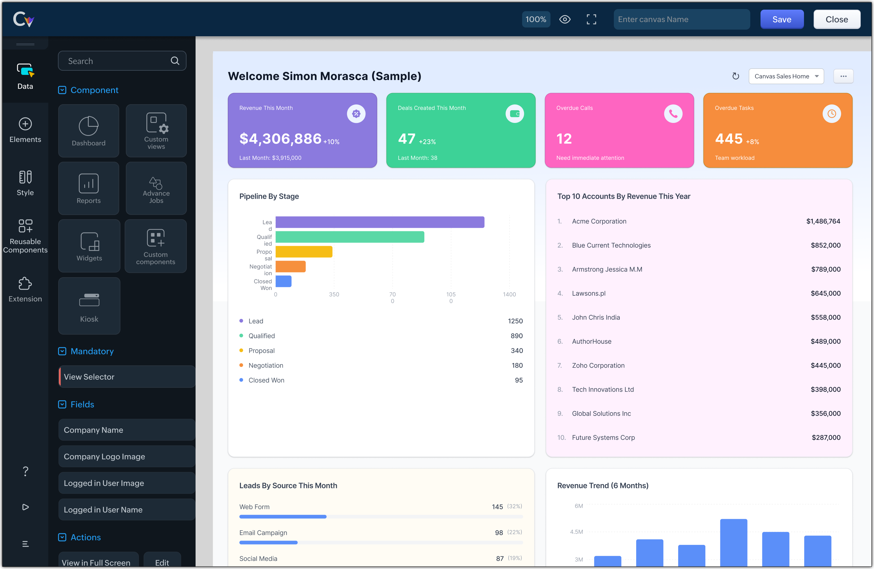 Canvas Home View suportă un set de componente care te ajută să prezinți datele clar și să efectuezi acțiuni rapide. Poți folosi componente precum: