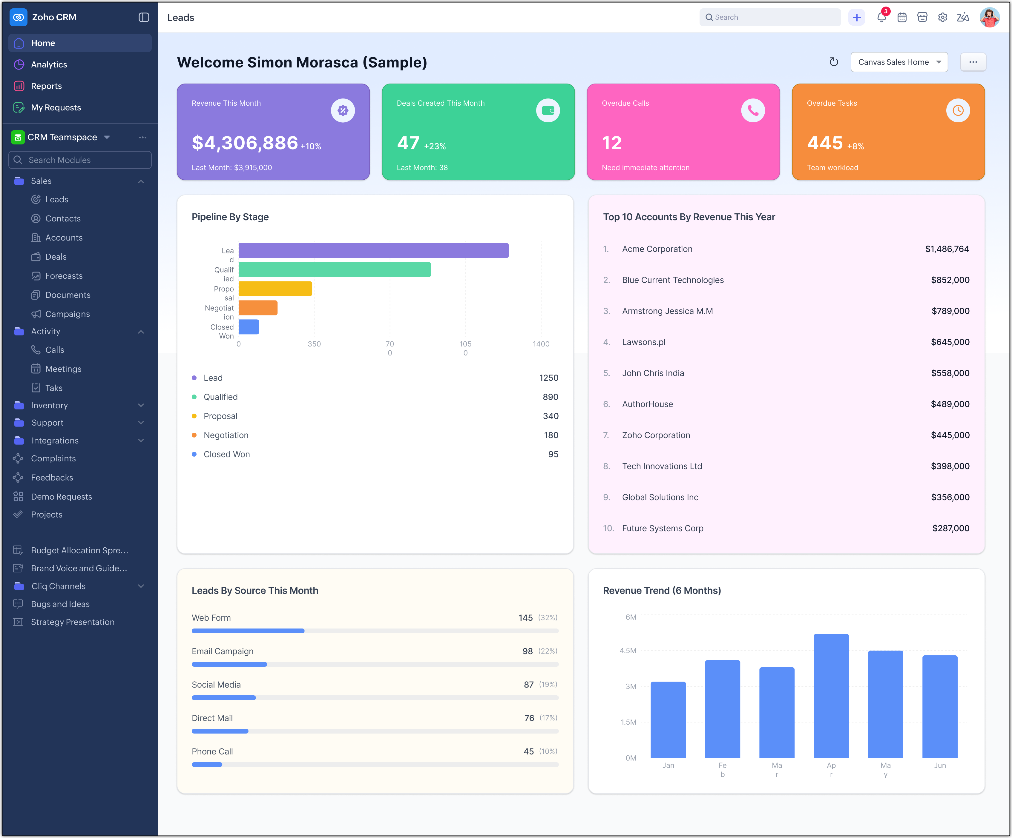 Canvas Home View este conceput pentru a îmbunătăți modul în care utilizatorii interacționează cu Zoho CRM chiar din momentul în care se conectează. Se concentrează pe a face pagina de start mai relevantă, bazată pe roluri și orientată spre acțiune.