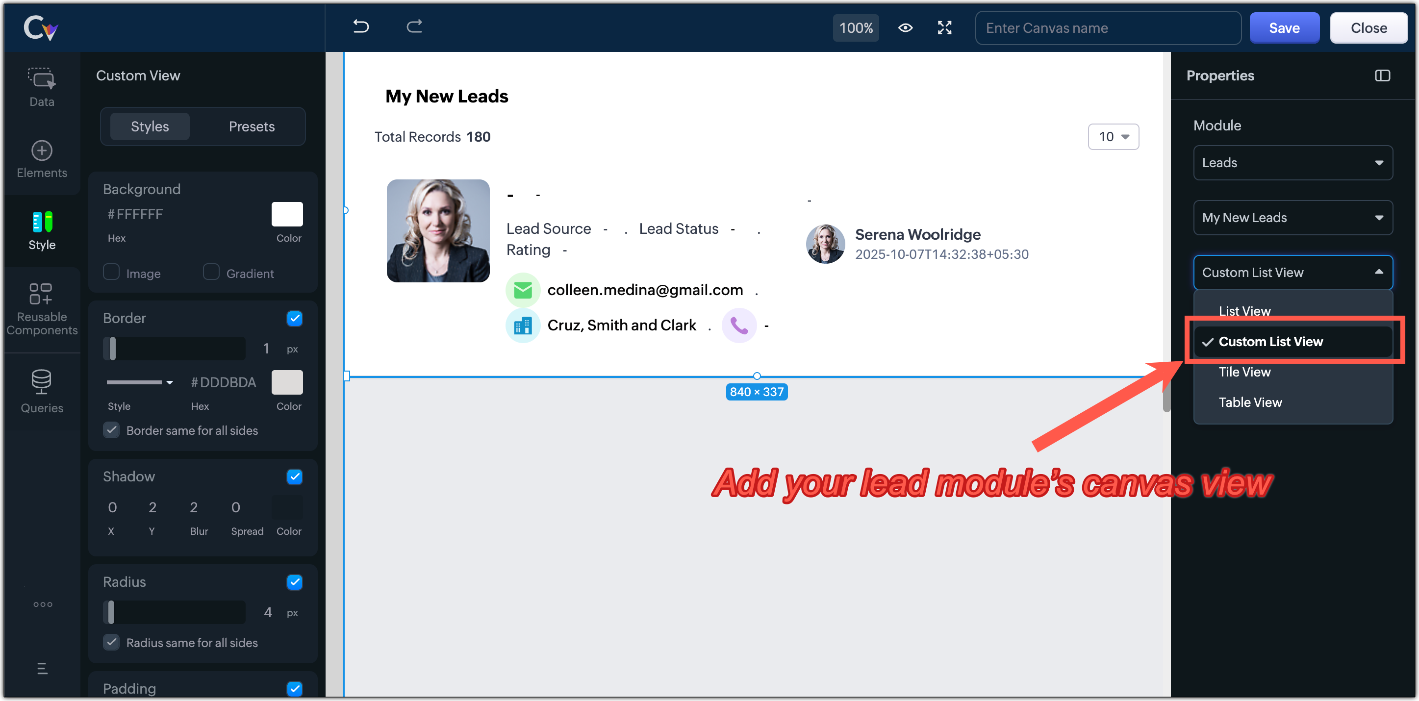 Acum poți adăuga vizualizările tale de liste din canvas ca vizualizări de liste personalizate în pagina de start. Orice vizualizare de liste creată în Canvas poate fi utilizată pentru a reda un Custom View în Home View. Toate cele trei tipuri de vizualizări de liste Canvas sunt suportate: Custom List View, Card sau Tile View și Table View.