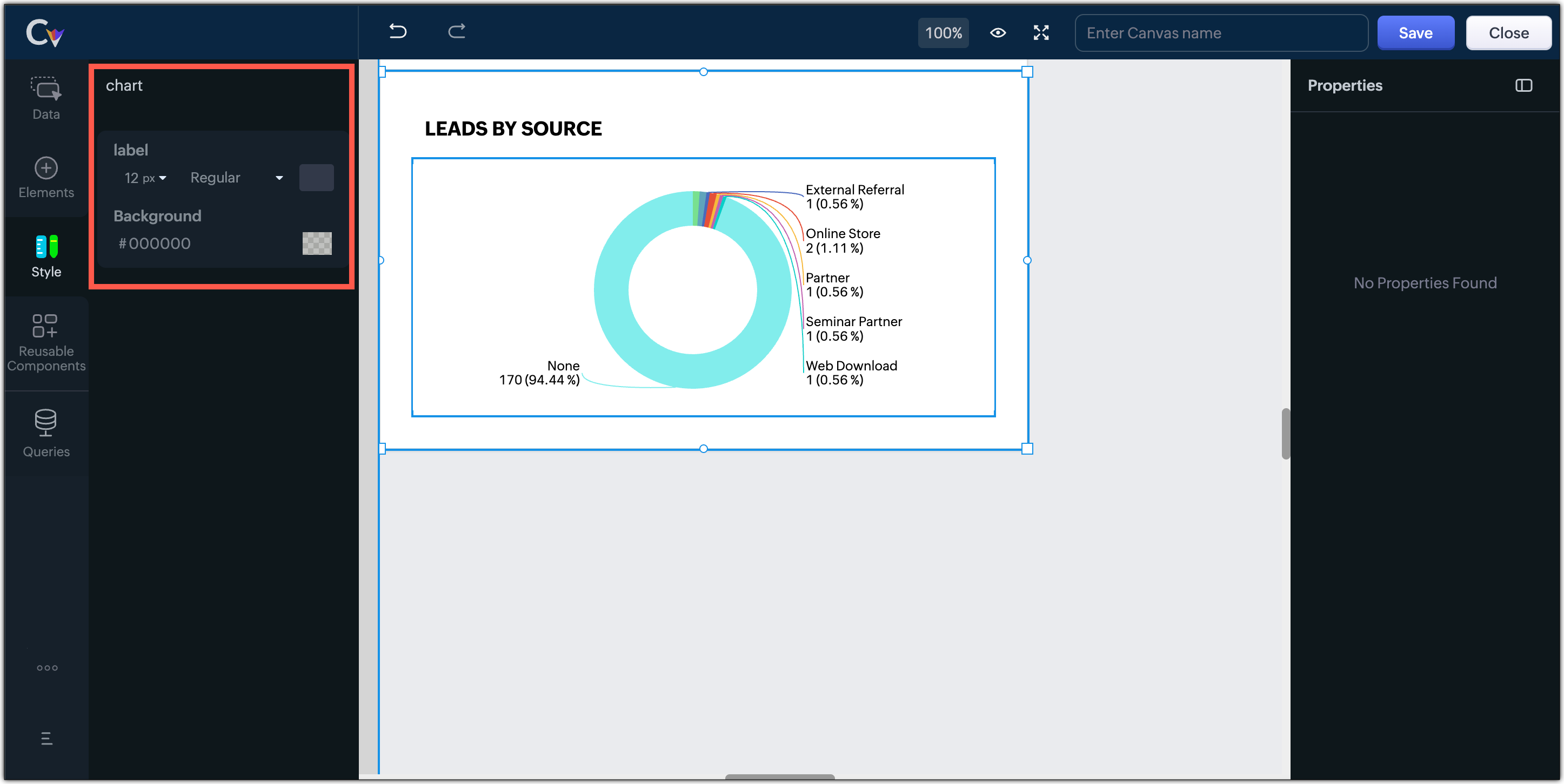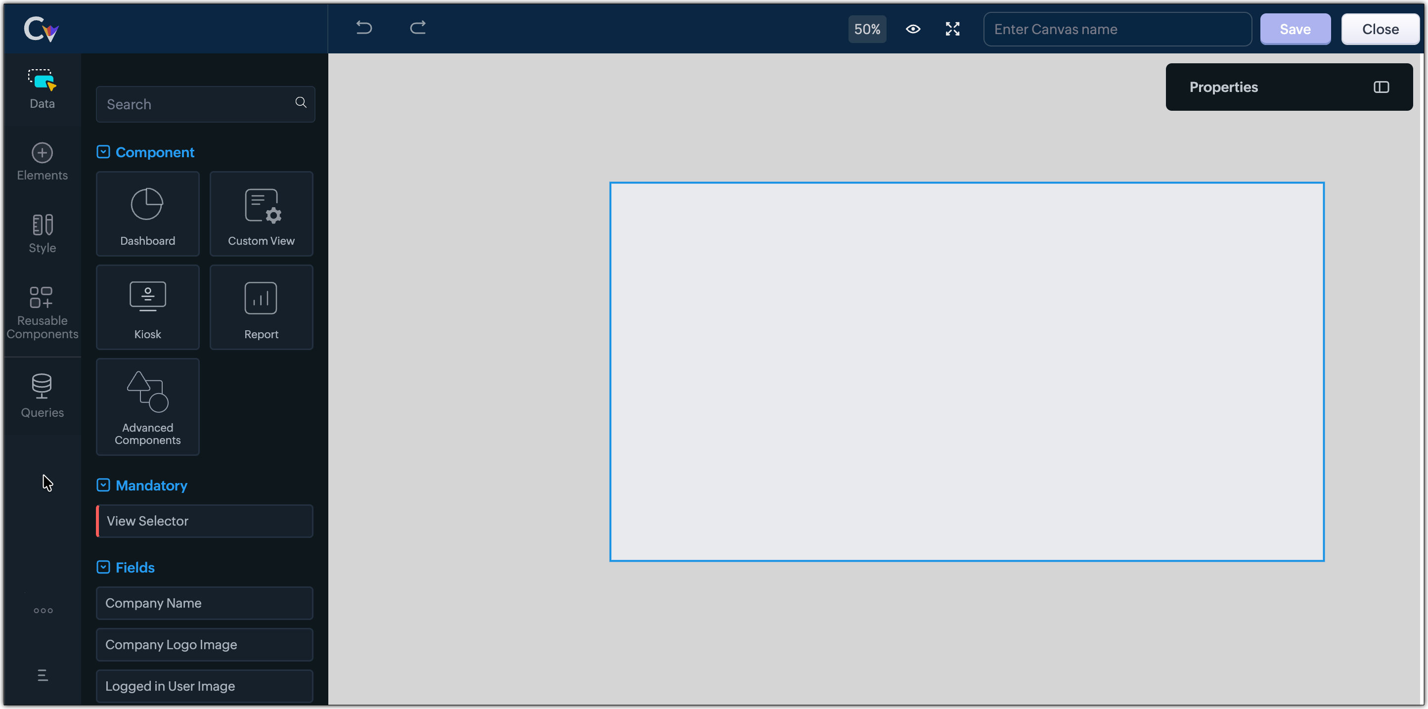 - Se deschide constructorul Canvas. Trage și plasează componente pe canvas.